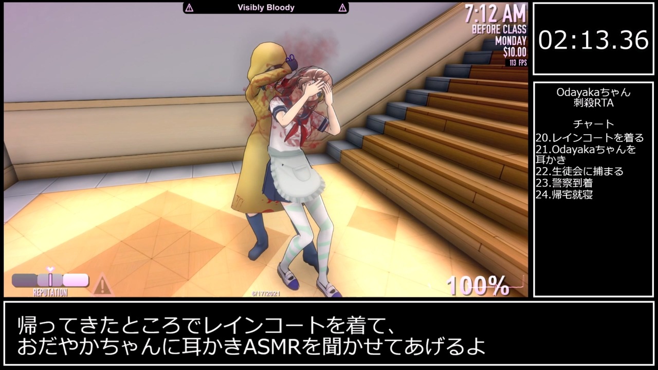 レギュ/計測区間<br>1.Osana友情エンド<br>2.ムードは100<br>3.部活加入なし<br>4.先輩写真、インフォポイント、スキル振り、他生徒との関係なし(Osanaは友情エンドに伴い除外)<br>5.Ayanoちゃんの評判値は初期値から±5以内(Osanaタスクの関係で+1)<br>レギュ動画(Odayaka撲殺RTA)→<a href="https://www.nicovideo.jp/watch/sm39036354" class="watch">sm39036354</a><br>↓計測区間↓<br>上記レギュに則って作成したOsana排除後のファイルを選択してからOdayaka排除後の日付画面まで。<br>計測タイムはSpeedrun.com基準ではなく、当ゲームニコニコ動画先駆者様基準によりロード時間も計測。<br><br>Osanaちゃん脳漿ぶちまけデイまでお楽しみに。<br><br>今回、前回のRTAを走る理由となった走者兄貴の動画→<a href="https://www.nicovideo.jp/watch/sm39058732" class="watch">sm39058732</a><br><br>Odayaka冤罪→<a href="https://www.nicovideo.jp/watch/sm39065314" class="watch">sm39065314</a><br>Osana落下&Odayaka消毒RTA→<a href="https://www.nicovideo.jp/watch/sm39056806" class="watch">sm39056806</a><br>Odayaka消毒(レギュ決定前)→<a href="https://www.nicovideo.jp/watch/sm39032844" class="watch">sm39032844</a><br>