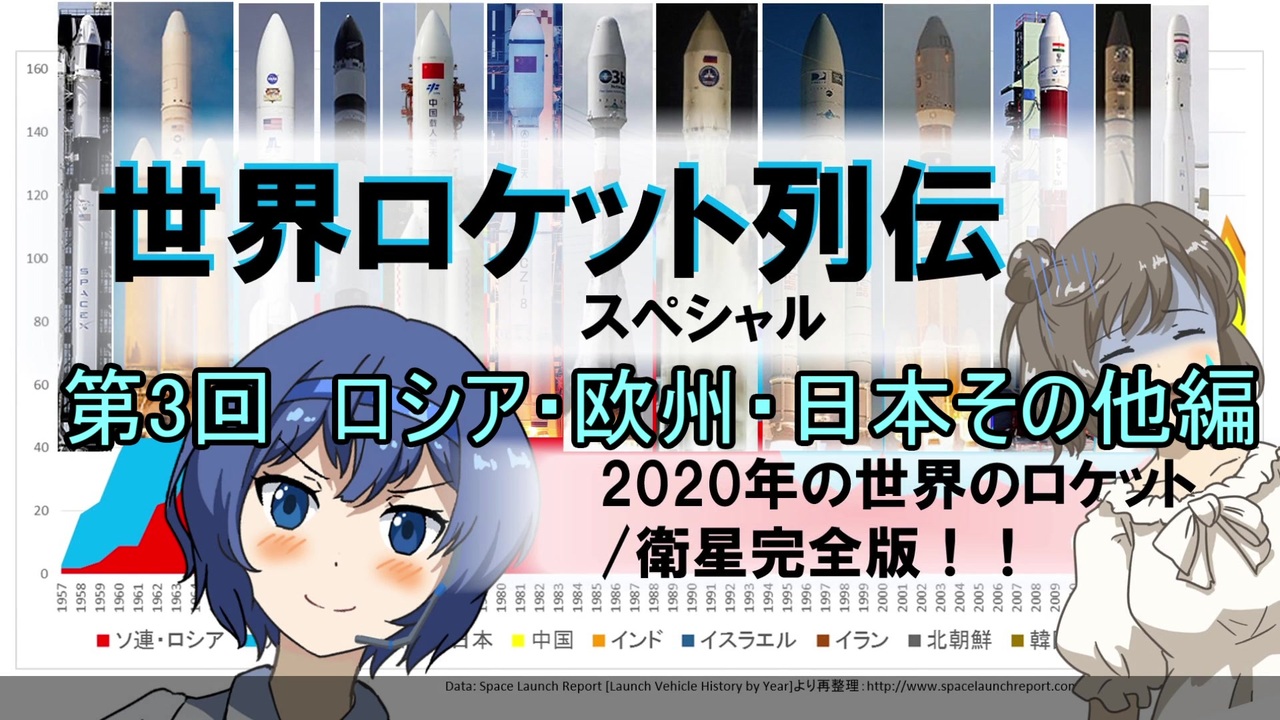 <span style="color: #000000; font-size: 14px;">お久しぶりです!<br>アメリカ編</span><a href="https://www.nicovideo.jp/watch/sm38807538" class="watch">sm38807538</a> 中国編 <a href="https://www.nicovideo.jp/watch/sm38945691" class="watch">sm38945691</a> に引き続き、今回も2020年に打ちあがった世界のロケットと衛星を、つづみちゃんたちが徹底的に紹介します!<br><br>ロシア・ヨーロッパ・日本・インド・イラン・イスラエル…<br><span style="color: #000000; font-size: 14px;">世界でどんなロケットが、どのような衛星を積んで、何のために宇宙に飛び立っているのでしょうか?</span><br>宇宙開発解説マイリス <span style="color: #006699; font-size: 14px;">mylist/</span>66566849 <br><br><span style="color: #000000; font-size: 14px;">お借りしているささらちゃん&つづみちゃんの立ち絵:ある名 様 </span><br>BGM:コンテンツツリー及びH/MIX gallery "草原を行く"”作戦会議”<br>====================<br><span style="color: #000000; font-size: 14px;">本動画の元データ:基本的には動画内で記載。それ以外は以下</span><br>Gunter Krebs氏:Gunter's Space Page <span style="color: #006699; font-size: 14px;"><a href="https://space.skyrocket.de/" target="_blank" rel="noopener nofollow">https://space.skyrocket.de/</a></span><br>Ed Kyle氏:Space Launch Report <a href="https://www.spacelaunchreport.com/" target="_blank" rel="noopener nofollow">https://www.spacelaunchreport.com/</a><br>本編中のイラン・イスラエルの打ち上げ動画<br>イラン:<a href="https://www.youtube.com/watch?v=vkq-o555gYI" target="_blank" rel="noopener nofollow">https://www.youtube.com/watch?v=vkq-o555gYI</a><br>イスラエル:<a href="https://www.youtube.com/watch?v=lMUMERLjLAs" target="_blank" rel="noopener nofollow">https://www.youtube.com/watch?v=lMUMERLjLAs</a> ←直しました<br><br><span style="color: #000000; font-size: 14px;">PS:KSPでロケット飛ばしてます(最近ご無沙汰ですが…)~よろしければぜひ。</span><br><span style="color: #006699; font-size: 14px;"><a href="https://www.nicovideo.jp/mylist/59573448" target="_blank" rel="noopener">mylist/59573448</a></span>