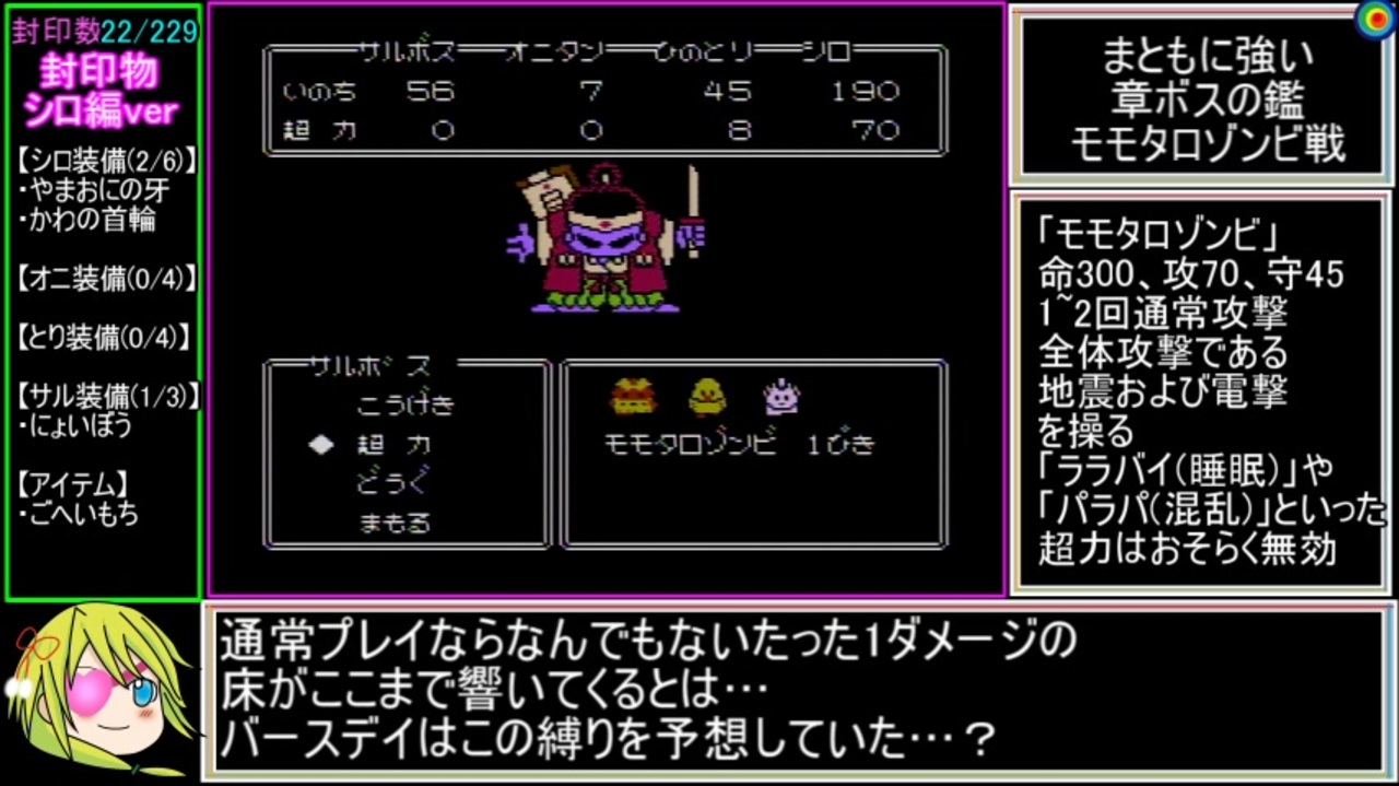 投稿にちょっと時間がかかったのはシャミ子が悪いんだよ<br><br>☆縛り内容☆<br>①レベルアップごとに超力・剣技・アイテム・装備が封印(奇数レベルになったら2封印)<br>②じゅうべえウォーク可(逃走および雑魚吟味、ボス戦で負けてリセットも可)<br>③システム上回避不可事項については緩和措置あり<br>④経験値の絡んだリセット禁止(ドロップを見てからのリセット)<br>⑤編集は頑張らない(やりたいようにはやる)<br><br>☆備考(上記③の詳細含む)☆<br>・装備変更不可時に装備物が封印された場合、代わりに1封印捧げて以降の使用を可とする(任意)<br>・封印済み装備の下取り代不問<br>・封印されたロバロバの中身チェックは江戸到達時と必須戦闘時のみとする<br>・露骨な難易度破壊は禁止(げんない解禁時点で封印前に30万両錬金しておく等)<br>・連戦時は最後にまとめて封印を行う<br>・その他諸々は基本テンポ重視、面白さ重視で<br>・まだ封印されていない対象物は出来るだけ「」で表記する<br><br>リスペクト元動画→<a href="https://www.nicovideo.jp/watch/sm37350612" class="watch">sm37350612</a><br>重要度表記とか参考にさせてもらってます→<a href="https://www.nicovideo.jp/watch/sm38385314" class="watch">sm38385314</a><br><br>part1→<a href="https://www.nicovideo.jp/watch/sm38924604" class="watch">sm38924604</a><br>前verプリ☆チャン→<a href="https://www.nicovideo.jp/watch/sm39043832" class="watch">sm39043832</a>、前ver例のアレ→<a href="https://www.nicovideo.jp/watch/sm39044239" class="watch">sm39044239</a><br>次→<a href="https://www.nicovideo.jp/watch/sm39181513" class="watch">sm39181513</a>