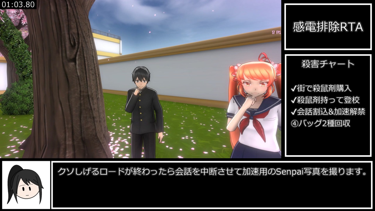 絵名の新規☆4引けなかったので初投稿です。<br><br><a href="https://www.nicovideo.jp/watch/sm39073935" class="watch">sm39073935</a>←前回<<a href="https://www.nicovideo.jp/mylist/71414199" target="_blank" rel="noopener">mylist/71414199</a>>次回→<a href="https://www.nicovideo.jp/watch/sm39204850" class="watch">sm39204850</a><br><br><u>レギュレーション</u><br><strong><u>Electrocute(感電)<br>Osanaを感電させて殺害。</u></strong><br><u>計測区間</u><br><strong><u>新規ファイル選択~スタッフロールまで<br>ロード時間も計測(ニコニコ動画先駆者基準)</u></strong><br><u>ロード時間を除外(speedrun.com基準)</u><br><br>にんどう兄貴の感電RTA動画→<a href="https://www.nicovideo.jp/watch/sm38837347" class="watch">sm38837347</a><br>しじみ兄貴のシリーズ→<a href="https://www.nicovideo.jp/series/243736" target="_blank" rel="noopener">series/243736</a><br><br>無編集版(speedrun.com基準タイマー)→<a href="https://youtu.be/-hqPZg5GW9Q" target="_blank" rel="noopener nofollow">https://youtu.be/-hqPZg5GW9Q</a><br><br>前回のクソしげるロードの検証に複数の検証コメいただきありがとうございます。<br>寄せられたコメントだとかなりの高スペックでも30秒ぐらい掛かるという方が多かったですが、他の走者兄貴の動画を見てみるとクソしげる20秒台の兄貴もいて結局何が影響するのか……<br><br>↓追記(8/02)↓<br>おまけで紹介した噴水ワープバグ、詳細な条件はまだわかりませんがOsanaを殺害すると使用不可になるみたいです。<br>Attack Stealth%で使えないかと思いましたが無理そうですね…
