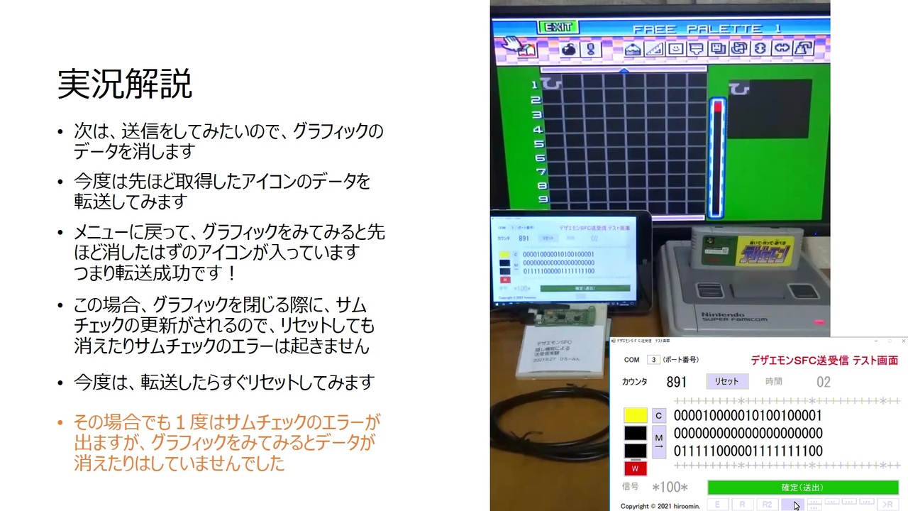 デザエモン隠しメッセージにある通信機能を使う例のポケコン版公開しました。(GitHub)<br><a href="https://github.com/hiroomin/pokekon_dezaemon-challenge" target="_blank" rel="noopener nofollow">https://github.com/hiroomin/pokekon_dezaemon-challenge</a><br><br><span style="color: #ff0000;"><strong>Arduino UNO R3用プログラムを配布 → <a href="https://www.nicovideo.jp/watch/sm43218240" class="watch">sm43218240</a><br><br>↓ これまでわかった事、秘話等も盛り込んでいますので、あわせてご覧ください<br>デザエモン(SFC)隠しメッセージ 謎解きヒストリー<br><a href="http://thanks-pawapass.info/hiroomin/dezaemon.html" target="_blank" rel="noopener nofollow">http://thanks-pawapass.info/hiroomin/dezaemon.html</a></strong></span><br><br>デザエモン(スーファミ版)にある、隠しメッセージの謎・・・・<br>コントローラーポートを使って、データの送受信が自由自在にできる???<br>にわかには信じがたいが、もしほんとうにそんなものが仕込まれているなら<br>謎のままにしておくのは惜しい。。<br><br>ついったーで経緯はご報告していた通り<br>私も、こうみえて、わりと苦労して、泥臭く、<br>そしてたどりつきました。。。<br><br>27年越しの謎。ニッチ産業すぎることもあり、一応は世界初の成功?です。<br>Dezaemon (SFC) Special Menu Communication Mode Launched Success!<br><br>こういうので、通信のしくみや身近な電子工作、プログラミングなどに<br>興味を持ってもらいたく、解説動画(詳しくない人向け)にまとめました。<br>参考になれば幸いです。<br><br><br>★ブログにも書きました<br><a href="http://blog.livedoor.jp/hiroomin/archives/52510706.html" target="_blank" rel="noopener nofollow">http://blog.livedoor.jp/hiroomin/archives/52510706.html</a><br><br>★この隠しメッセージについて参考にしたページ<br>(情報元・THE CUTTING ROOM FLOOR)<br><a href="https://tcrf.net/Kaite_Tsukutte_Asoberu_Dezaemon" target="_blank" rel="noopener nofollow">https://tcrf.net/Kaite_Tsukutte_Asoberu_Dezaemon</a><br><a href="http://415elm.blog50.fc2.com/blog-entry-2.html" target="_blank" rel="noopener nofollow">http://415elm.blog50.fc2.com/blog-entry-2.html</a><br><br>Twitter:<br><a href="https://twitter.com/hiroominpps/status/1411143420274302976" target="_blank" rel="noopener nofollow">https://twitter.com/hiroominpps/status/1411143420274302976</a><br><a href="https://twitter.com/hiroominpps/status/1411289667018756097" target="_blank" rel="noopener nofollow">https://twitter.com/hiroominpps/status/1411289667018756097</a>