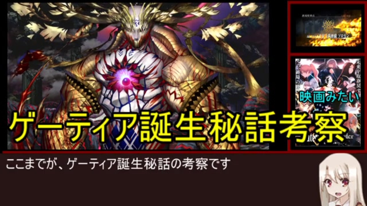 この動画は2部6章のアヴァロンルフェから、ゲーティアを考察しています。山羊ラビット氏の『《真FGO ブリテン異聞帯 考察》 カルデアの詰みポイント 』を少し触れてます。<br>・ゲーティアが生まれた理由<br>・レフ教授が魔神柱になったタイミング<br>・レフ教授の序章の動き(特に爆破後の動き)<br>・マリスビリーの行動<br><br>山羊ラビット氏の2部6章考察動画↓<br>《真FGO ブリテン異聞帯 考察》 カルデアの詰みポイント :<a href="https://www.nicovideo.jp/watch/sm39095962" class="watch">sm39095962</a><br><br>いいねに、山羊ラビット氏からのアドバイス概要<br>勉強になって、マジ感謝です。<br><br><br>路地裏考察マイリスト→<a href="https://www.nicovideo.jp/mylist/71060497" target="_blank" rel="noopener">mylist/71060497</a><br>FGO考察マイリスト→<a href="https://www.nicovideo.jp/mylist/70012622" target="_blank" rel="noopener">mylist/70012622</a><br>次動画→<a href="https://www.nicovideo.jp/watch/sm39149501" class="watch">sm39149501</a><br>前動画→<a href="https://www.nicovideo.jp/watch/sm39084167" class="watch">sm39084167</a>(夜中さんの感想)<br>
