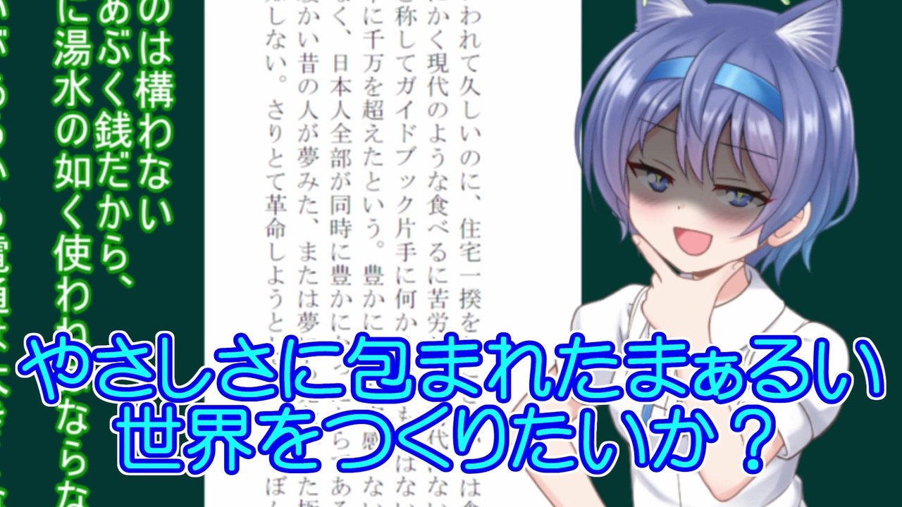 <span style="color: #ff0000; font-size: 24px;"><strong>ツイてない事も大きなチャンスになるかもしれない!</strong></span><br><span style="font-size: 10px;">ならないかもしれない</span><br><br>この動画は「みつるぎ動画視聴祭」への参加を想定して作ったものです<br>みつるぎ動画視聴祭の詳細はこちら<br><a href="https://twitter.com/Zmitsulugi/status/1421787793638903818?s=20" target="_blank" rel="noopener nofollow">https://twitter.com/Zmitsulugi/status/1421787793638903818?s=20</a><br>みつるぎさんとはこの方:<a href="https://www.nicovideo.jp/user/5107159" target="_blank" rel="noopener">user/5107159</a><br><br>「いいねくーださい。」は一応許可頂いてます<br><span style="font-size: 10px;">闇の取引で脅したとかじゃナイデス</span><br><br>広告者様紹介に名前がございませんがKinTuba1835様にも広告を頂きました<br>この場を借りて御礼申し上げます<br><br>最近面白かった動画<br><a href="https://www.nicovideo.jp/watch/sm39098103" class="watch">sm39098103</a><br><a href="https://www.nicovideo.jp/watch/sm39088587" class="watch">sm39088587</a><br><a href="https://www.nicovideo.jp/watch/sm39082367" class="watch">sm39082367</a><br><a href="https://www.nicovideo.jp/watch/sm39089159" class="watch">sm39089159</a><br><a href="https://www.nicovideo.jp/watch/sm39074475" class="watch">sm39074475</a><br><a href="https://www.nicovideo.jp/watch/sm39071168" class="watch">sm39071168</a><br><a href="https://www.nicovideo.jp/watch/sm39073761" class="watch">sm39073761</a><br><br>山本夏彦の本<br><br>「毒言独語」<br>1/2:<a href="https://www.nicovideo.jp/watch/sm37818135" class="watch">sm37818135</a><br>2/2:<a href="https://www.nicovideo.jp/watch/sm37849633" class="watch">sm37849633</a><br><br>「ダメの人」<br>1/4:<a href="https://www.nicovideo.jp/watch/sm38290824" class="watch">sm38290824</a><br>2/4:<a href="https://www.nicovideo.jp/watch/sm38496502" class="watch">sm38496502</a><br>3/4:<a href="https://www.nicovideo.jp/watch/sm38707422" class="watch">sm38707422</a><br>4/4:<a href="https://www.nicovideo.jp/watch/sm38813636" class="watch">sm38813636</a><br><br>「オーイどこ行くの」<br>1/?:<a href="https://www.nicovideo.jp/watch/sm38672845" class="watch">sm38672845</a><br>2/?:<a href="https://www.nicovideo.jp/watch/sm38739779" class="watch">sm38739779</a><br>3/?:<a href="https://www.nicovideo.jp/watch/sm39043736" class="watch">sm39043736</a><br>4/?:無いかもしれない<br><br>「私の岩波物語」<br>1/?:ここ<br>2/?:生きてたら<br><br>冗談か本気か分からないことをつぶやいているところ<br><a href="https://twitter.com/n__m__e" target="_blank" rel="noopener nofollow">https://twitter.com/n__m__e</a>
