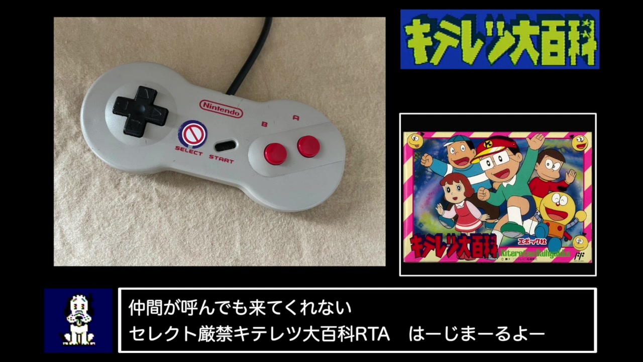 セレクトボタンが物理的に抜かれたコントローラーで、FCキテレツ大百科RTAを走りました。<br>自己ベストタイムの動画に茶番とゆっくり実況をつけました。<br><br>プレイ環境:ニューファミコン実機+純正コントローラー(セレクト抜き)<br><br><br><br><br>コロ助は絶対許さない。<br><br>[おまけ] セレ禁RTA 初回クリア (実況なし) → <a href="https://www.nicovideo.jp/watch/sm39142515" class="watch">sm39142515</a><br>通常RTA WR ゆっくり実況→ <a href="https://www.nicovideo.jp/watch/sm38975278" class="watch">sm38975278</a><br>コロ助増殖バグ → <a href="https://www.nicovideo.jp/watch/sm38702486" class="watch">sm38702486</a><br><br>(2021/11/6追記)<br>RTA in Japan Winter 2021でキテレツを走ることになりました。