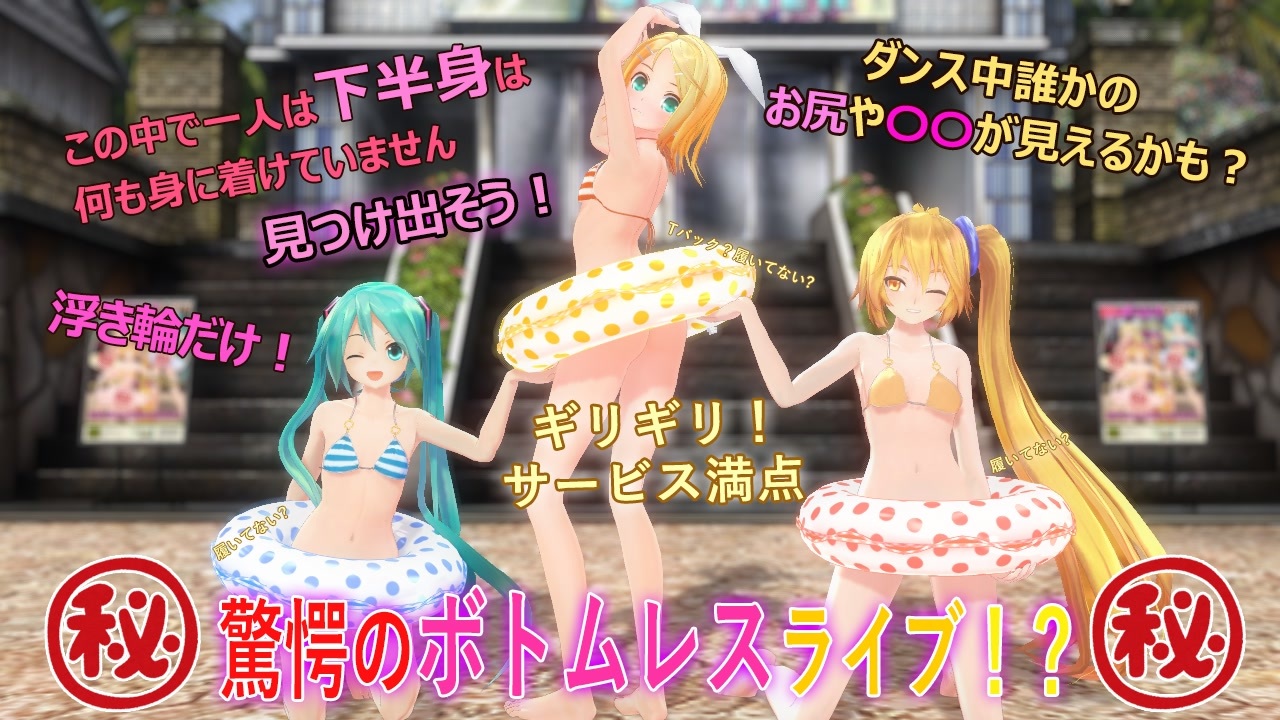 ミクちゃん、ネルちゃん、リンちゃんに浮き輪を持ちながらHurlyBurlyを踊ってもらいました。<br>実は一人だけ浮き輪だけで履いていないボトムレスの子がいます。<br>探してみましょう。(難易度低)<br><br>Twitter <a href="https://twitter.com/uep20" target="_blank" rel="noopener nofollow">https://twitter.com/uep20</a> の小ネタを動画にしてみました。<br><br>神社シリーズ⇒『<a href="https://www.nicovideo.jp/mylist/48936086" target="_blank" rel="noopener">mylist/48936086</a>』<br>単発物⇒『<a href="https://www.nicovideo.jp/mylist/49565666" target="_blank" rel="noopener">mylist/49565666</a>』