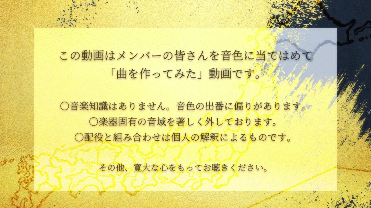 メンバーの皆さんを楽器の音色に当てはめて曲を作ってみました。<br><br>都l道l府l県ΗoI動画より、ずっと作りたくて力及ばなかった曲が完成しました。<br>何年経っても大好きなシリーズのひとつです、よろしくお願いします。<br><br>・例によって楽器固有の音域を<strong>著しく</strong>逸脱しています。ご了承ください。<br>・本家様への迷惑になる行為はお控えください。<br>・無断転載はご遠慮ください。<br><br>作ったもの:<a href="https://www.nicovideo.jp/mylist/63760456" target="_blank" rel="noopener">mylist/63760456</a><br>前作:<a href="https://www.nicovideo.jp/watch/sm37430411" class="watch">sm37430411</a><br><br>(夏だ!ΗoIだ!電撃戦だ!)<br>
