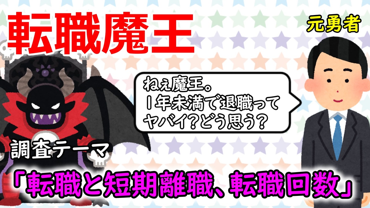 調査スプレッドシート↓<br><a href="https://docs.google.com/spreadsheets/d/1LYYhkFXXZPJxJjMGMKDRjbdMLL0IVmfPHrpp6RBwWJA/edit?usp=sharing" target="_blank" rel="noopener nofollow">https://docs.google.com/spreadsheets/d/1LYYhkFXXZPJxJjMGMKDRjbdMLL0IVmfPHrpp6RBwWJA/edit?usp=sharing</a><br><br>前<a href="https://www.nicovideo.jp/watch/sm38851733" class="watch">sm38851733</a>(経験年数・勤続年数は転職に影響するのか)<br>次<a href="https://www.nicovideo.jp/watch/sm39660553" class="watch">sm39660553</a>(転職において学歴はどれほど影響するのか)<br><br><br>その他作品(いらすとや動画等)<a href="https://www.nicovideo.jp/mylist/54754050" target="_blank" rel="noopener">mylist/54754050</a><br>Fの就職情報<a href="https://f-syukatu.com" target="_blank" rel="noopener nofollow">https://f-syukatu.com</a><br><br>youtubeチャンネル<br><a href="https://www.youtube.com/playlist?list=PLCjQBaWqLbQ3PSHosCZE-stWkEtyUZ051" target="_blank" rel="noopener nofollow">https://www.youtube.com/playlist?list=PLCjQBaWqLbQ3PSHosCZE-stWkEtyUZ051</a><br><br>ツイッター<br><a href="https://twitter.com/F_kokutiyou" target="_blank" rel="noopener nofollow">https://twitter.com/F_kokutiyou</a>