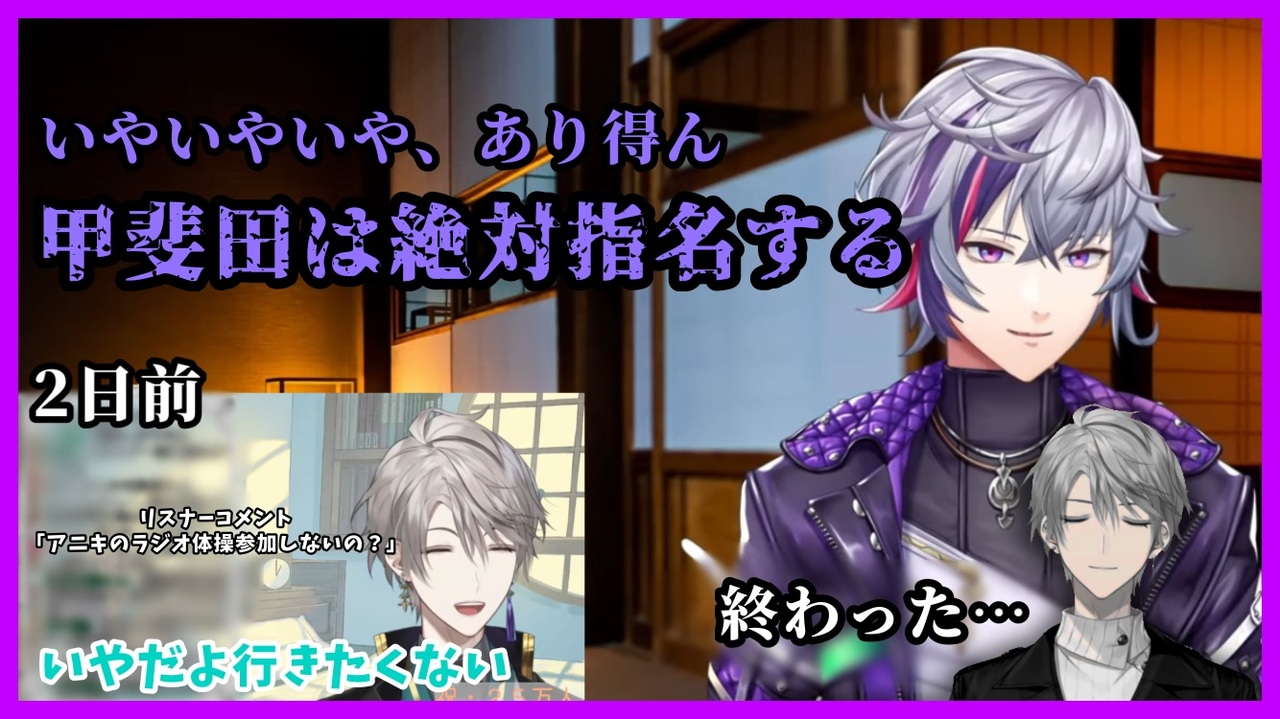 『にじライバー健康計画』への参加でオールしようとせんでもろて<br><br>みんなで健康になろう<br><br>甲斐田参加回↓↓↓<br>【#にじさんじラジオ体操部】にじライバー健康計画5日目【にじさんじ】 <br><a href="https://youtu.be/VJfvjBcRcKc" target="_blank" rel="noopener nofollow">https://youtu.be/VJfvjBcRcKc</a> <br><br>※当方の投稿動画は『誹謗中傷を含むもの』<br>または『動画に関係のない人の名前を出しているもの』のコメントを削除させて頂く可能性があります。<br><br>※また、こちらの動画を通して出演している方や特定の人物への誹謗中傷の意図は一切ございません。<br><br><br><br>#にじさんじ切り抜き #切り晴り<br>--------------------<br><br><br>元配信一覧<br><br>【 記念配信 】16~25万人の記念を一気にやる男 ~プチ発表あり~【甲斐田晴/にじさんじ】 <br><a href="https://youtu.be/QL6jF15iOQ0" target="_blank" rel="noopener nofollow">https://youtu.be/QL6jF15iOQ0</a><br><br>【ママにゲーム隠された】マジで " ありえん " 【にじさんじ 】 <br><a href="https://youtu.be/WIOc2gKaM_Y" target="_blank" rel="noopener nofollow">https://youtu.be/WIOc2gKaM_Y</a> <br><br>【 弾き語り 】納涼【甲斐田晴/にじさんじ】 <br><a href="https://youtu.be/EnYlddYmrtU" target="_blank" rel="noopener nofollow">https://youtu.be/EnYlddYmrtU</a> <br><br><br><br>【#にじさんじラジオ体操部】にじライバー健康計画1日目【にじさんじ】 <br><a href="https://youtu.be/l4MJRqVup34" target="_blank" rel="noopener nofollow">https://youtu.be/l4MJRqVup34</a><br><br>【#にじさんじラジオ体操部】にじライバー健康計画2日目【にじさんじ】 <br><a href="https://youtu.be/Ek4BP4n3gcg" target="_blank" rel="noopener nofollow">https://youtu.be/Ek4BP4n3gcg</a><br><br>【#にじさんじラジオ体操部】にじライバー健康計画3日目【にじさんじ】 <br><a href="https://youtu.be/8cOvnvIkwLs" target="_blank" rel="noopener nofollow">https://youtu.be/8cOvnvIkwLs</a><br><br><br><br>出演<br><br>甲斐田晴<br>@Kaida_Haru<br><a href="https://www.youtube.com/channel/UCo2N7C-Z91waaR6lF3LL_jw" target="_blank" rel="noopener nofollow">https://www.youtube.com/channel/UCo2N7C-Z91waaR6lF3LL_jw</a><br><br>不破湊<br>@Fuwa_Minato <br><a href="https://youtube.com/channel/UC6wvdADTJ88OfIbJYIpAaDA" target="_blank" rel="noopener nofollow">https://youtube.com/channel/UC6wvdADTJ88OfIbJYIpAaDA</a><br><br><br>編集:万哨 @banSho_milk