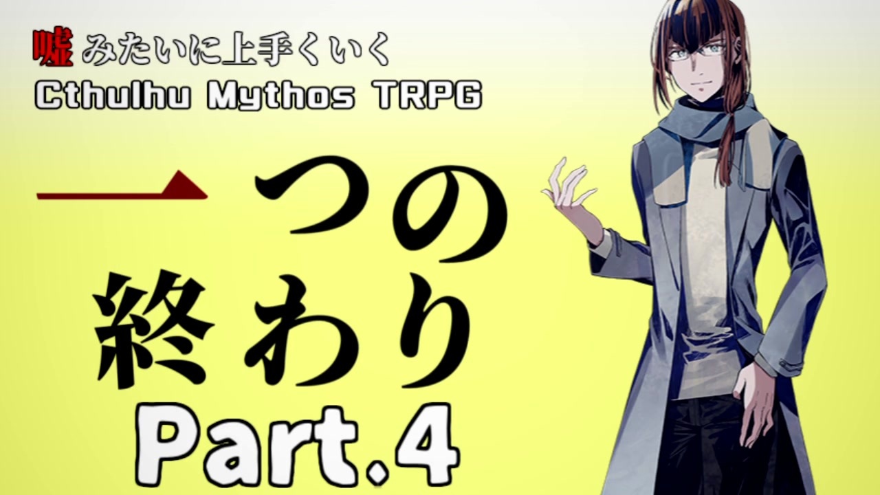 当時のぼくも「どゆことー!?」って思いながら唱えてた気がする<br><br>うそうま卓のクトゥルフ神話TRPGリプレイ動画、第一チーム(九鬼、キリコ、ちはる、教授、タナカ、富田)最終章です。<br><br>前:<a href="https://www.nicovideo.jp/watch/sm39124668" class="watch">sm39124668</a> / 次:少々お待ちください<br />【 うそうま卓シナリオ等まとめ:<a href="https://usouma.booth.pm/" target="_blank" rel="noopener nofollow">https://usouma.booth.pm/</a> 】<br><br>マイリスト:<a href="https://www.nicovideo.jp/mylist/57250859" target="_blank" rel="noopener">mylist/57250859</a> <a href="https://www.nicovideo.jp/mylist/67175059" target="_blank" rel="noopener">mylist/67175059</a><br>ツイッター <a href="https://twitter.com/shitouba_trpg" target="_blank" rel="noopener nofollow">https://twitter.com/shitouba_trpg</a><br>連絡先 usouma1010@gmail.com<br><br>クトゥルフ神話TRPG<br>第1チーム立ち絵:転(くるり)さん <a href="https://twitter.com/kururirura" target="_blank" rel="noopener nofollow">https://twitter.com/kururirura</a><br>第2チーム立ち絵:茨乃(しの)さん <a href="https://twitter.com/sino_eefy" target="_blank" rel="noopener nofollow">https://twitter.com/sino_eefy</a><br>第3チーム立ち絵:スイさん <a href="https://twitter.com/moe_sui" target="_blank" rel="noopener nofollow">https://twitter.com/moe_sui</a><br>