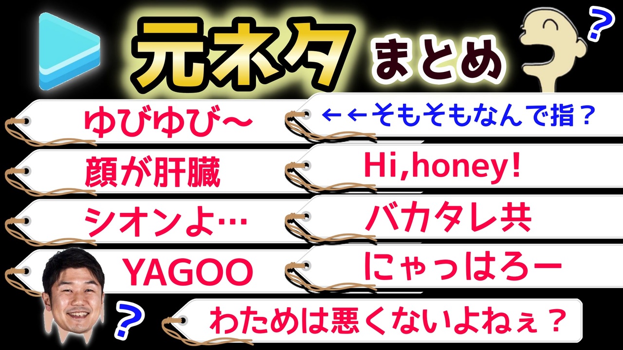 ホロライブ語録(用語)の元ネタ・起源・使い方などを初心者さんにもなるべくわかりやすいようにまとめました<br><br><a href="#" class="seekTime" data-seekTime="0:00" onclick="seekNicoPlayer('#0:00'); return false;">#0:00</a> ゆびゆび~ の起源<br><br><a href="#" class="seekTime" data-seekTime="0:34" onclick="seekNicoPlayer('#0:34'); return false;">#0:34</a> そもそもなんで「指」なの?<br><br><a href="#" class="seekTime" data-seekTime="1:09" onclick="seekNicoPlayer('#1:09'); return false;">#1:09</a> シオンよ… の起源<br><br><a href="#" class="seekTime" data-seekTime="1:41" onclick="seekNicoPlayer('#1:41'); return false;">#1:41</a> Hi,honey! の起源<br><br><a href="#" class="seekTime" data-seekTime="1:54" onclick="seekNicoPlayer('#1:54'); return false;">#1:54</a> わためは悪くないよねぇ の起源<br><br><a href="#" class="seekTime" data-seekTime="3:19" onclick="seekNicoPlayer('#3:19'); return false;">#3:19</a> 顔が肝臓 の起源<br><br><a href="#" class="seekTime" data-seekTime="3:33" onclick="seekNicoPlayer('#3:33'); return false;">#3:33</a> にゃっはろー の由来<br><br><a href="#" class="seekTime" data-seekTime="4:31" onclick="seekNicoPlayer('#4:31'); return false;">#4:31</a> バカタレ共 の起源<br><br><a href="#" class="seekTime" data-seekTime="5:24" onclick="seekNicoPlayer('#5:24'); return false;">#5:24</a> YAGOO の起源<br><br><a href="#" class="seekTime" data-seekTime="5:46" onclick="seekNicoPlayer('#5:46'); return false;">#5:46</a> ホロライブ がアイドル事務所になった起源<br><br><a href="#" class="seekTime" data-seekTime="7:17" onclick="seekNicoPlayer('#7:17'); return false;">#7:17</a> みこちはなんで「にぇ」って言うの?(おまけ)<br><br><br>※文字数オーバーの為元動画はYouTube版にて→<a href="https://youtu.be/YnZyDFMfoHw" target="_blank" rel="noopener nofollow">https://youtu.be/YnZyDFMfoHw</a><br><br>#ホロライブ切り抜き #hololive #ホロライブ元ネタ<br>