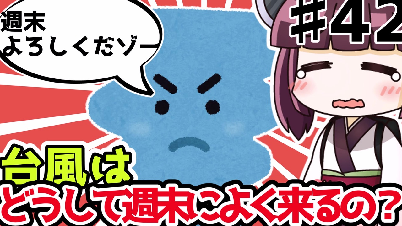 きりたん「台風は北半球では常に反時計回り」<br><br>牛車のyoutubeチャンネル<br><a href="https://www.youtube.com/channel/UCnJOWymDsLlP5cxRWOrO9rg" target="_blank" rel="noopener nofollow">https://www.youtube.com/channel/UCnJOWymDsLlP5cxRWOrO9rg</a><br><br>twitter<br><a href="https://twitter.com/gyuusha3" target="_blank" rel="noopener nofollow">https://twitter.com/gyuusha3</a><br><br>▽動画一覧<br>(1)~(11)はここ<br><a href="https://www.nicovideo.jp/series/191180?ref=pc_watch_description_series" target="_blank" rel="noopener nofollow">https://www.nicovideo.jp/series/191180?ref=pc_watch_description_series</a><br><br>(12)~はここ<br><a href="https://www.nicovideo.jp/series/205308?ref=pc_watch_description_series" target="_blank" rel="noopener nofollow">https://www.nicovideo.jp/series/205308?ref=pc_watch_description_series</a><br><br>(31)どうして牛肉は高いの? <a href="https://www.nicovideo.jp/watch/sm38963888" class="watch">sm38963888</a><br>(32)この夏お試しあれ タレハムソーメン <a href="https://www.nicovideo.jp/watch/sm38968404" class="watch">sm38968404</a><br>(33)レンジで味噌なめたけ <a href="https://www.nicovideo.jp/watch/sm38988743" class="watch">sm38988743</a><br>(34)人力でもダルゴナコーヒー <a href="https://www.nicovideo.jp/watch/sm38993290" class="watch">sm38993290</a><br>(35)大戸屋の鯖定食3000円~はぼったくりなの? <a href="https://www.nicovideo.jp/watch/sm38997691" class="watch">sm38997691</a><br>(36)THEズボラ飯カオマンガイ <a href="https://www.nicovideo.jp/watch/sm39027056" class="watch">sm39027056</a><br>(37)カップラーメンは太るの?その理由は? <a href="https://www.nicovideo.jp/watch/sm39031458" class="watch">sm39031458</a><br>(38)むね肉美味化ケチャマヨチキン <a href="https://www.nicovideo.jp/watch/sm39060397" class="watch">sm39060397</a><br>(39)あずきバーはどうしてあんなに固いの? <a href="https://www.nicovideo.jp/watch/sm39062774" class="watch">sm39062774</a><br>(40)わかめはハゲ改善に本当に効くの? <a href="https://www.nicovideo.jp/watch/sm39096611" class="watch">sm39096611</a><br>(41)どうしてお寿司にワサビをいれるの? <a href="https://www.nicovideo.jp/watch/sm39133273" class="watch">sm39133273</a><br>(42)台風はどうして週末によく来るの? <a href="https://www.nicovideo.jp/watch/sm39159578" class="watch">sm39159578</a><br><br>▽使用したもの<br>録画→ AGデスクトップレコーダー<br>編集→ YMM4、CeVIO 、東北きりたん、棒読みちゃん<br>音楽→ OtoLogic、、効果音ラボ、youtubeオーディオ、甘茶の音楽工房<br>立ち絵→ Noname さん と 新島秋一 さん と 桐野拓海 さん と akihiyoさん<br><br>コメントありがとうございます<br>最後まで視聴してくださりありがとうございます。