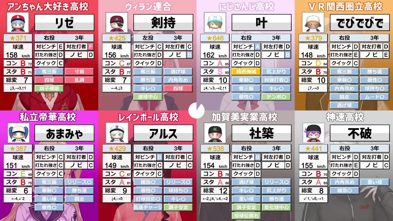 にじさんじ甲子園2021で各監督が育成した選手の<br>ポジション別ステータス比較動画です。<br><br>注意<br>・投稿者の一言コメントや栄冠動画の切抜などはありません。ステ-タスを並べて比較<br> することだけを目的としています。<br>・この動画の比較はスタメンを予想して行っています。本番のスタメンは異なる<br> 可能性が大いにあります。<br>・ピッチャーの2枚目、3枚目の基準は★の数です。登板する順番ではありません。<br><br>監督<br>アンジュ監督:<a href="https://www.youtube.com/channel/UCHVXbQzkl3rDfsXWo8xi2qw" target="_blank" rel="noopener nofollow">https://www.youtube.com/channel/UCHVXbQzkl3rDfsXWo8xi2qw</a><br>笹木監督:<a href="https://www.youtube.com/channel/UCoztvTULBYd3WmStqYeoHcA" target="_blank" rel="noopener nofollow">https://www.youtube.com/channel/UCoztvTULBYd3WmStqYeoHcA</a><br>椎名監督:<a href="https://www.youtube.com/channel/UC_4tXjqecqox5Uc05ncxpxg" target="_blank" rel="noopener nofollow">https://www.youtube.com/channel/UC_4tXjqecqox5Uc05ncxpxg</a><br>樋口監督:<a href="https://www.youtube.com/channel/UCsg-YqdqQ-KFF0LNk23BY4A" target="_blank" rel="noopener nofollow">https://www.youtube.com/channel/UCsg-YqdqQ-KFF0LNk23BY4A</a><br>鷹宮監督:<a href="https://www.youtube.com/channel/UCV5ZZlLjk5MKGg3L0n0vbzw" target="_blank" rel="noopener nofollow">https://www.youtube.com/channel/UCV5ZZlLjk5MKGg3L0n0vbzw</a><br>小野町監督:<a href="https://www.youtube.com/channel/UCg63a3lk6PNeWhVvMRM_mrQ" target="_blank" rel="noopener nofollow">https://www.youtube.com/channel/UCg63a3lk6PNeWhVvMRM_mrQ</a><br>加賀美監督:<a href="https://www.youtube.com/channel/UCmovZ2th3Sqpd00F5RdeigQ" target="_blank" rel="noopener nofollow">https://www.youtube.com/channel/UCmovZ2th3Sqpd00F5RdeigQ</a><br>葛葉監督:<a href="https://www.youtube.com/channel/UCSFCh5NL4qXrAy9u-u2lX3g" target="_blank" rel="noopener nofollow">https://www.youtube.com/channel/UCSFCh5NL4qXrAy9u-u2lX3g</a><br><br>主催<br>舞元啓介:<a href="https://www.youtube.com/channel/UCJubINhCcFXlsBwnHp0wl_g" target="_blank" rel="noopener nofollow">https://www.youtube.com/channel/UCJubINhCcFXlsBwnHp0wl_g</a><br>天開司:<a href="https://www.youtube.com/channel/UCZYyhgoV314CM14zBD6vd4A" target="_blank" rel="noopener nofollow">https://www.youtube.com/channel/UCZYyhgoV314CM14zBD6vd4A</a><br><br><br>これまで作ったもの→<a href="https://www.nicovideo.jp/mylist/61814815" target="_blank" rel="noopener">mylist/61814815</a>
