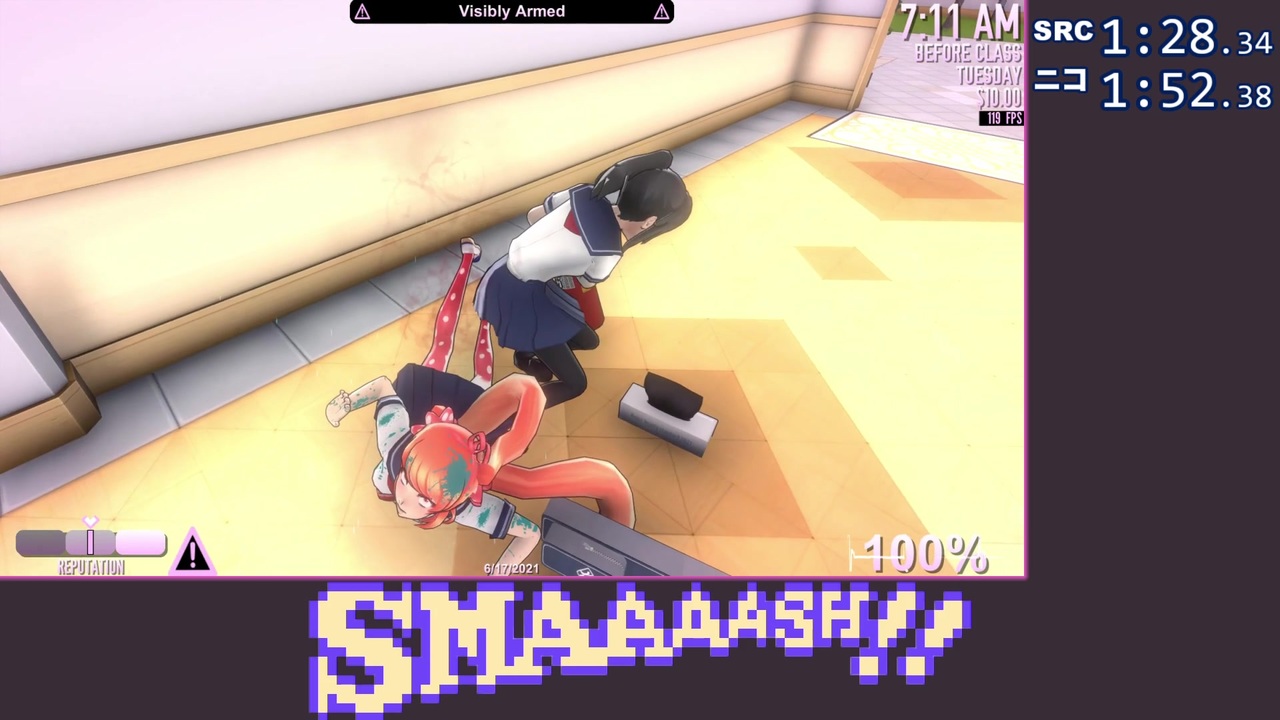 きょうはなんにもないすばらしい一日だった(NPC談).<br><br>今回はNep様の記録を37秒更新しました.<br>見つかりそうで見つからない隙を狙う大胆さが魅力なカテゴリ,<br>ルート開拓中は攻撃する瞬間毎回ドキドキしていたのを覚えています.<br><br>オマケは <a href="#" class="seekTime" data-seekTime="5:13" onclick="seekNicoPlayer('#5:13'); return false;">#5:13</a> から.<br><br>先駆者様: <a href="https://www.nicovideo.jp/watch/sm39073935" class="watch">sm39073935</a><br><br><strong>・</strong><strong><u>タイマー開始: 空ファイル選択</u></strong><br><strong>・</strong><strong><u>タイマー停止: クレジットの Skip アイコン表示</u></strong><br><strong>・</strong><strong><u>ロード時間は,SpeedRun→タイマーポーズ,ニコニコ→計測</u></strong><br><strong>・</strong><strong><u>ルール: </u></strong><br><strong> - </strong><strong><u>Attack(物理攻撃)で排除</u></strong><br><strong> - </strong><strong><u>警戒なし</u></strong><br><strong> - </strong><strong><u>死体や血だまり,血まみれ武器や服は見つかる前に処分</u></strong><br><br>ヤンデレシミュレータ本家: <a href="https://www.yanderesimulator.com/" target="_blank" rel="noopener nofollow">https://www.yanderesimulator.com/</a><br><br><strong>追記:</strong> しじみ兄貴に<s>そそのかされて</s>勧められて<br>SpeedRun.comに投稿し<s>てしまい</s>ました→<a href="https://www.speedrun.com/yansim/run/y931w1ry" target="_blank" rel="noopener nofollow">https://www.speedrun.com/yansim/run/y931w1ry</a>