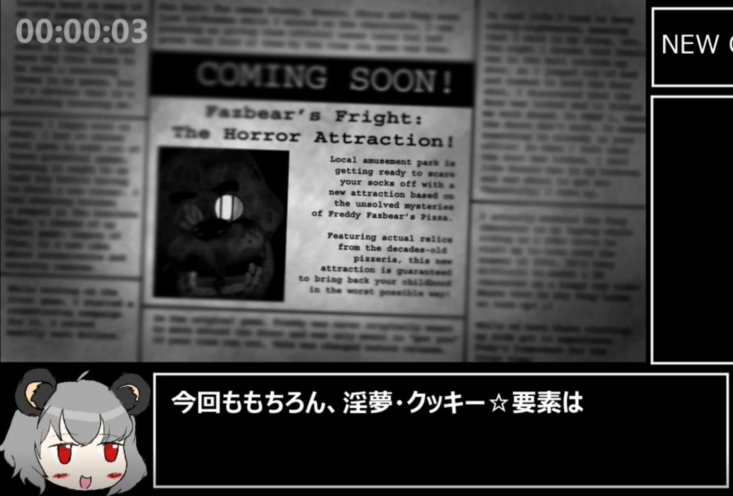 <span style="color: #ff9900; font-size: 18px;">舞台はピザ屋からお化け屋敷へ…</span><br>追記)com→camです。なんで気づかなかったんですかねぇ…<br>長らくお待たせして申し訳ありません<br>Five Nights at Freddy's3 通称FNAF3のGood Ending any%RTAのpart1となります<br>今回もよろしくお願いします!<br>次回→<a href="https://www.nicovideo.jp/watch/sm39210371" class="watch">sm39210371</a><br><br>FNAF無印RTA part1→<a href="https://www.nicovideo.jp/watch/sm38838632" class="watch">sm38838632</a><br>FNAF2RTA part1→<a href="https://www.nicovideo.jp/watch/sm38903652" class="watch">sm38903652</a><br />FNAF RTAマイリスト <a href="https://www.nicovideo.jp/mylist/71729876" target="_blank" rel="noopener">mylist/71729876</a><br>参考にさせていただいているWiki様→<a href="https://fnaf.swiki.jp/" target="_blank" rel="noopener nofollow">https://fnaf.swiki.jp/</a><br>Twitter→ <a href="https://twitter.com/shilviass" target="_blank" rel="noopener nofollow">https://twitter.com/shilviass</a><br>youtube→<a href="https://www.youtube.com/channel/UCmOIEb76TtHFbBYzMRQpAUQ" target="_blank" rel="noopener nofollow">https://www.youtube.com/channel/UCmOIEb76TtHFbBYzMRQpAUQ</a>