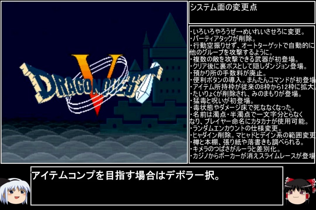 物凄くサムネ映えするシーンが何個もあったのに、シリーズ最初はOPにするという縛りのせいで普通のサムネになってしまった悲しみ。仲間になるモンスター次第で解禁する予定の物が変わるドラクエⅤの始まりです!<br><br>(ニコニコの動画投稿上限が無制限になるとの情報をいただきました! 嬉しい反面、一生懸命作ったのに一ヶ月しか活躍していないPIXIVFANBOX君の行く末は次回にお話しします)<br><br>前→<a href="https://www.nicovideo.jp/watch/sm39103767" class="watch">sm39103767</a> 次→<a href="https://www.nicovideo.jp/watch/sm39193388" class="watch">sm39193388</a><br><br>YouTube版→<a href="https://www.youtube.com/watch?v=cuMUKqCwzG4&t=616s" target="_blank" rel="noopener nofollow">https://www.youtube.com/watch?v=cuMUKqCwzG4&t=616s</a><br><br><br>※動画の大きさが変わる方は、お手数ですが設定→画質を自動から〇pに変えると解決します。<br>※一部機種は互換機を使用してのプレイとなります。<br><br>縛りルール(不明点はシリーズのQ&Aを参照)<br>①使った武器・防具・装飾品・道具・呪文・特技・一部特殊施設(メダル王・カジノ・移民の町)・職業(3,6,7)・仲間モンスター(4,5,6,8+7の職業)は次以降のシリーズで使用禁止。<br>(NPCキャラが使用した装備や呪文を含む。売却及び錬金素材としても使用扱い)<br><br>②裏技・バグ技の禁止。<br><br>③逃走禁止&戦闘終了時は全員生存。<br><br>④レベルを上げ過ぎない。<br>ダンジョンやボスは公式ガイドブックに記載されたレベル+3まで。<br>ラスボスは全ての呪文を習得するレベル+3程度までに収める。<br><br>⑤裏ボスも規定回数、規定ターン以内に倒す。<br>(6の裏ダンジョン突入時のみ、条件を満たすため①の職業を解禁)<br><br>(おまけ)<br>宝は可能なものに限り全回収。<br>5と6は同一モンスターの仲間不可。<br>回避可能なボスも全て倒す。<br><br><br>この動画で利用している株式会社スクウェア・エニックスを代表とする共同著作者が権利を所有する著作物及びスギヤマ工房有限会社が権利を所有する楽曲の転載・配布は禁止いたします。<br>(C) ARMOR PROJECT/BIRD STUDIO/SQUARE ENIX All Rights Reserved.<br>(C) SUGIYAMA KOBO (P) SUGIYAMA KOBO<br><br>AquesTalk2ライセンスID:AQTK2WINUSR23122185<br /><br><br>❤いいねを押していただけるとモチベーションと投稿速度が上がるので宜しくお願い致します!<br><br>作者ツイッター→ <a href="https://twitter.com/nig0117" target="_blank" rel="noopener nofollow">https://twitter.com/nig0117</a><br>PIXIV FANBOX→ <a href="https://sutanokeiji.fanbox.cc/" target="_blank" rel="noopener nofollow">https://sutanokeiji.fanbox.cc/</a><br><br>( 以前はWEB小説書いてました→ <a href="https://kakuyomu.jp/works/1177354054884910267" target="_blank" rel="noopener nofollow">https://kakuyomu.jp/works/1177354054884910267</a> )