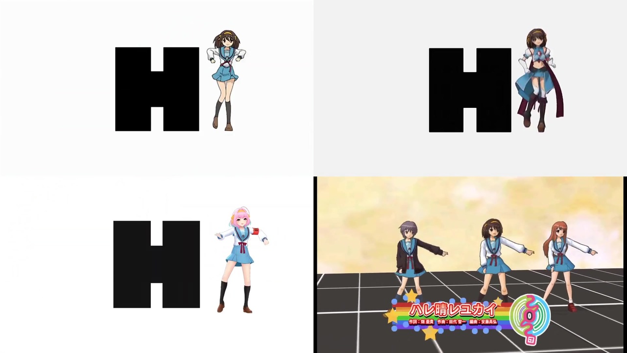 左上:本家 右上:涼宮ハルヒの戸惑 特典映像<br>左下:デレステ 右下:涼宮ハルヒの激動<br><br>動画はようつべから<br>音声はデレステで統一<br>またデレステに合わせて動画を調整してます