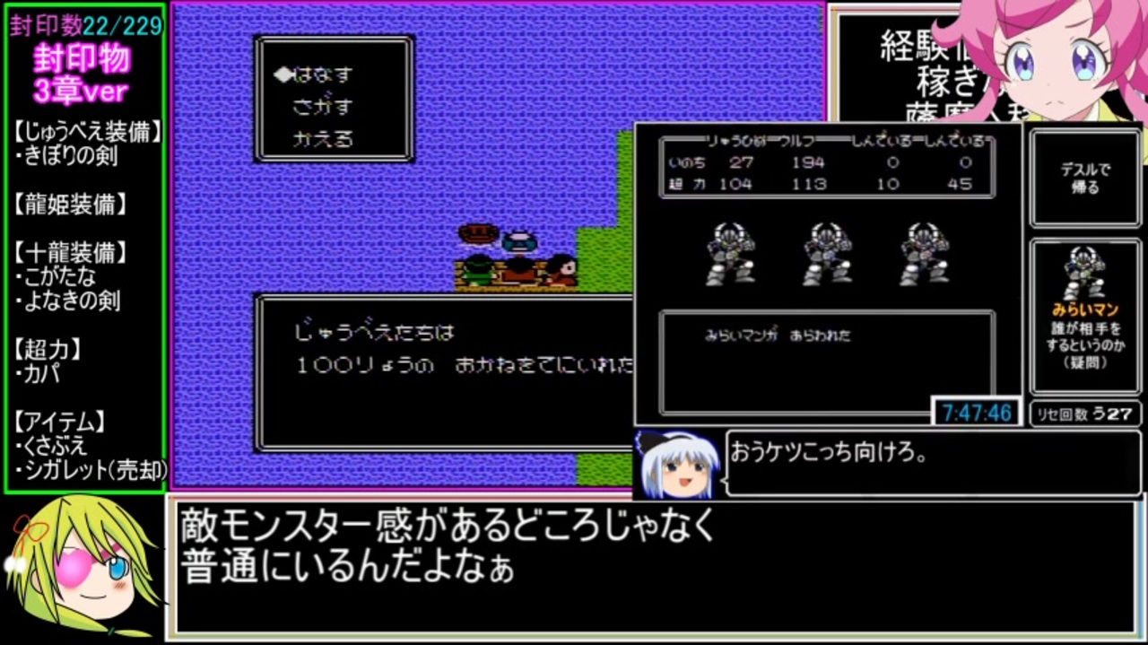 りゅうひめのロバロバ<br><br>☆縛り内容☆<br>①レベルアップごとに超力・剣技・アイテム・装備が封印(奇数レベルになったら2封印)<br>②じゅうべえウォーク可(逃走および雑魚吟味、ボス戦で負けてリセットも可)<br>③システム上回避不可事項については緩和措置あり<br>④経験値の絡んだリセット禁止(ドロップを見てからのリセット)<br>⑤編集は頑張らない(やりたいようにはやる)<br><br>☆備考(上記③の詳細含む)☆<br>・装備変更不可時に装備物が封印された場合、代わりに1封印捧げて以降の使用を可とする(任意)<br>・封印済み装備の下取り代不問<br>・封印されたロバロバの中身チェックは江戸到達時と必須戦闘時のみとする<br>・露骨な難易度破壊は禁止(げんない解禁時点で封印前に30万両錬金しておく等)<br>・連戦時は最後にまとめて封印を行う<br>・その他諸々は基本テンポ重視、面白さ重視で<br>・まだ封印されていない対象物は出来るだけ「」で表記する<br><br>リスペクト元動画→<a href="https://www.nicovideo.jp/watch/sm37350612" class="watch">sm37350612</a><br>重要度表記とか参考にさせてもらってます→<a href="https://www.nicovideo.jp/watch/sm38385314" class="watch">sm38385314</a><br><br>part1→<a href="https://www.nicovideo.jp/watch/sm38924604" class="watch">sm38924604</a><br>前→<a href="https://www.nicovideo.jp/watch/sm39097865" class="watch">sm39097865</a><br>次→<a href="https://www.nicovideo.jp/watch/sm39254203" class="watch">sm39254203</a>