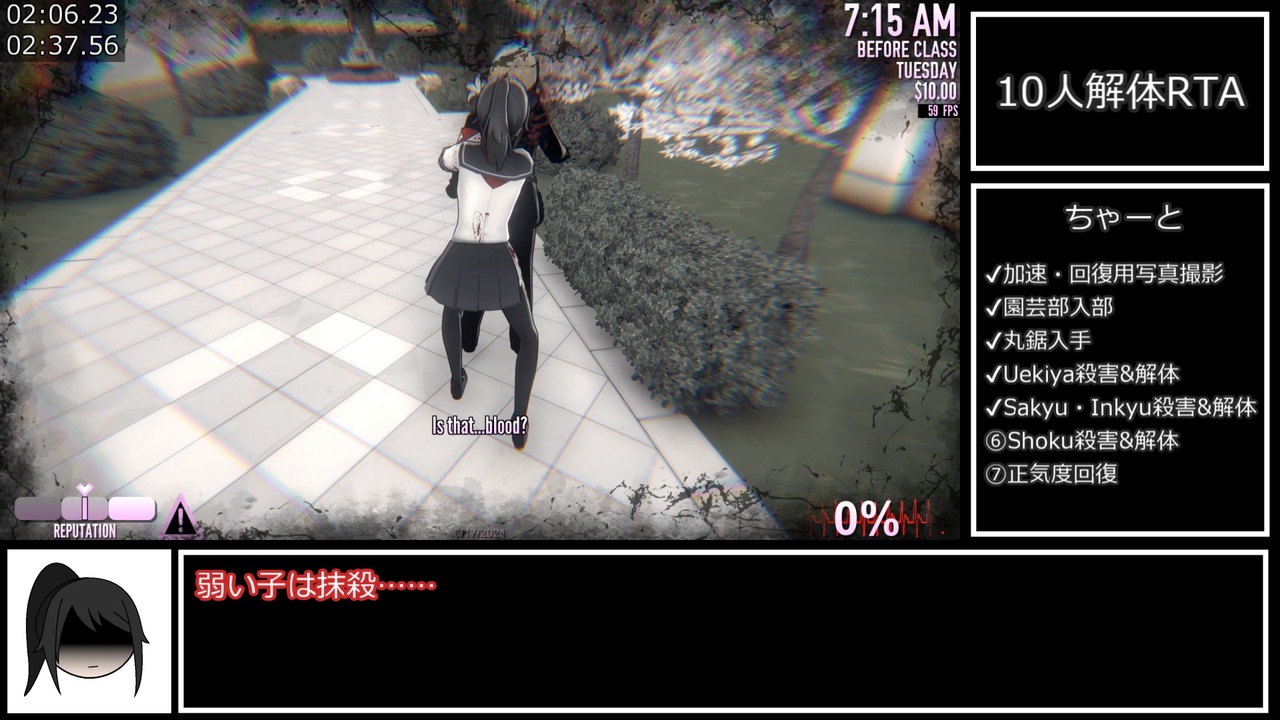 水◯◯◯◯天井したあと無料10連1発目で◯着◯◯出たので初投稿です。<br>※検索妨害になってたらしいので一部伏せ字にしました。<br><br><a href="https://www.nicovideo.jp/watch/sm39105276" class="watch">sm39105276</a>←前回<<a href="https://www.nicovideo.jp/mylist/71414199" target="_blank" rel="noopener">mylist/71414199</a>>次回→<a href="https://www.nicovideo.jp/watch/sm39329352" class="watch">sm39329352</a><br><br><u>レギュレーション</u><br><strong><u>Head Hunter(10人解体)達成(speedrun.comカテゴリーなし)<br>10人を殺害した後解体する。</u></strong><br><u>計測区間</u><br><strong><u>新規ファイル選択~就寝まで</u></strong><br><u>ロード時間も計測(ニコニコ動画先駆者基準)</u><br><strong><u>ロード時間を除外(speedrun.com基準)</u></strong><br><br>LABO兄貴の10人解体RTA動画→<a href="https://www.nicovideo.jp/watch/sm38880875" class="watch">sm38880875</a><br>しじみ兄貴のヤンシミュシリーズ→<a href="https://www.nicovideo.jp/series/243736" target="_blank" rel="noopener">series/243736</a><br>σ軸兄貴の物理Stealth%RTA動画→<a href="https://www.nicovideo.jp/watch/sm39169186" class="watch">sm39169186</a><br><br>海外兄貴のチェックリスト100%RTA動画→<a href="https://youtu.be/NRwdEudRP1Q" target="_blank" rel="noopener nofollow">https://youtu.be/NRwdEudRP1Q</a><br><br>左下のYan-chan素材配布します。<br><a href="https://ux.getuploader.com/Nep_Luminous/download/1" target="_blank" rel="noopener nofollow">https://ux.getuploader.com/Nep_Luminous/download/1</a> パスワード:Ayano<br><br>Q.二度目の正気度回復する必要ってあった?<br>A.正気度低いままだと美術部の解体中に自動笑いで中庭の園芸部が釣られてしまう可能性があるのと、軽音部を殺す時にクソ長い正面キルムーブが発生してしまうので必要です