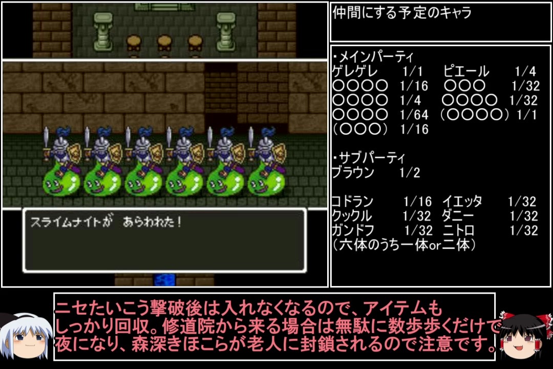 ネタバレになるためサムネに困る青年期前半。<br>予定通り仲間になってくれるかは不明ですが、それでも割と何とかなります。<br>(一番最後のコメント返信において、支援者の皆さんには『本当に頭が上がりません』が何故か消えてるっ!? 改めましてこの場にてお礼を。心より感謝しております!)<br><br>前→<a href="https://www.nicovideo.jp/watch/sm39193388" class="watch">sm39193388</a> 次→<a href="https://www.nicovideo.jp/watch/sm39245945" class="watch">sm39245945</a><br><br>YouTube版→<a href="https://www.youtube.com/watch?v=I9PB4pRObtE&t=777s" target="_blank" rel="noopener nofollow">https://www.youtube.com/watch?v=I9PB4pRObtE&t=777s</a><br><br><br>※動画の大きさが変わる方は、お手数ですが設定→画質を自動から〇pに変えると解決します。<br>※一部機種は互換機を使用してのプレイとなります。<br><br>縛りルール(不明点はシリーズのQ&Aを参照)<br>①使った武器・防具・装飾品・道具・呪文・特技・一部特殊施設(メダル王・カジノ・移民の町)・職業(3,6,7)・仲間モンスター(4,5,6,8+7の職業)は次以降のシリーズで使用禁止。<br>(NPCキャラが使用した装備や呪文を含む。売却及び錬金素材としても使用扱い)<br><br>②裏技・バグ技の禁止。<br><br>③逃走禁止&戦闘終了時は全員生存。<br><br>④レベルを上げ過ぎない。<br>ダンジョンやボスは公式ガイドブックに記載されたレベル+3まで。<br>ラスボスは全ての呪文を習得するレベル+3程度までに収める。<br><br>⑤裏ボスも規定回数、規定ターン以内に倒す。<br>(6の裏ダンジョン突入時のみ、条件を満たすため①の職業を解禁)<br><br>(おまけ)<br>宝は可能なものに限り全回収。<br>5と6は同一モンスターの仲間不可。<br>回避可能なボスも全て倒す。<br><br><br>この動画で利用している株式会社スクウェア・エニックスを代表とする共同著作者が権利を所有する著作物及びスギヤマ工房有限会社が権利を所有する楽曲の転載・配布は禁止いたします。<br>(C) ARMOR PROJECT/BIRD STUDIO/SQUARE ENIX All Rights Reserved.<br>(C) SUGIYAMA KOBO (P) SUGIYAMA KOBO<br><br>AquesTalk2ライセンスID:AQTK2WINUSR23122185<br /><br><br>❤いいねを押していただけるとモチベーションと投稿速度が上がるので宜しくお願い致します!<br><br>作者ツイッター→ <a href="https://twitter.com/nig0117" target="_blank" rel="noopener nofollow">https://twitter.com/nig0117</a><br>PIXIV FANBOX→ <a href="https://sutanokeiji.fanbox.cc/" target="_blank" rel="noopener nofollow">https://sutanokeiji.fanbox.cc/</a><br><br>( 以前はWEB小説書いてました→ <a href="https://kakuyomu.jp/works/1177354054884910267" target="_blank" rel="noopener nofollow">https://kakuyomu.jp/works/1177354054884910267</a> )