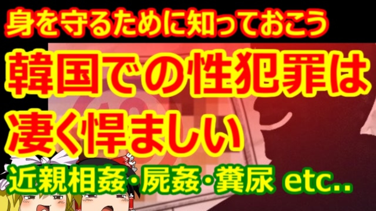 身を守るために知っておこう。悍ましき韓国人の最近の性犯罪。<br>【関連動画】<br>近親相姦が好き♡:<a href="https://www.nicovideo.jp/watch/sm36272975" class="watch">sm36272975</a><br>屍姦が好き♡:<a href="https://www.nicovideo.jp/watch/sm36287654" class="watch">sm36287654</a><br>排泄物が好き♡:<a href="https://www.nicovideo.jp/watch/sm37622431" class="watch">sm37622431</a><br>家出少女には売春強制:<a href="https://www.nicovideo.jp/watch/sm37691244" class="watch">sm37691244</a><br>嫌韓スペシャル第二回:<a href="https://www.nicovideo.jp/watch/sm36040947" class="watch">sm36040947</a><br>嫌韓スペシャル第三回:<a href="https://www.nicovideo.jp/watch/sm36041024" class="watch">sm36041024</a><br><br>YouTube上のセーフな話チャンネル<br><a href="https://www.youtube.com/channel/UCjSNLMlaGwq9C1BafK0vh9w" target="_blank" rel="noopener nofollow">https://www.youtube.com/channel/UCjSNLMlaGwq9C1BafK0vh9w</a><br><br>YouTube上の告知チャンネル<br><a href="https://www.youtube.com/channel/UCSBY4-4lDfLLi7bq3diVHnA" target="_blank" rel="noopener nofollow">https://www.youtube.com/channel/UCSBY4-4lDfLLi7bq3diVHnA</a><br><br>YouTube上のサブチャンネル<br><a href="https://www.youtube.com/channel/UCLB3-9hl2H4h1drSThv0y-A" target="_blank" rel="noopener nofollow">https://www.youtube.com/channel/UCLB3-9hl2H4h1drSThv0y-A</a><br><br>Rumble上のサブチャンネル<br><a href="https://rumble.com/user/Saku" target="_blank" rel="noopener nofollow">https://rumble.com/user/Saku</a><br><br>ニコニコ動画上の他のシリーズも宜しくね。<br><a href="https://www.nicovideo.jp/user/81752108/series" target="_blank" rel="noopener nofollow">https://www.nicovideo.jp/user/81752108/series</a><br>
