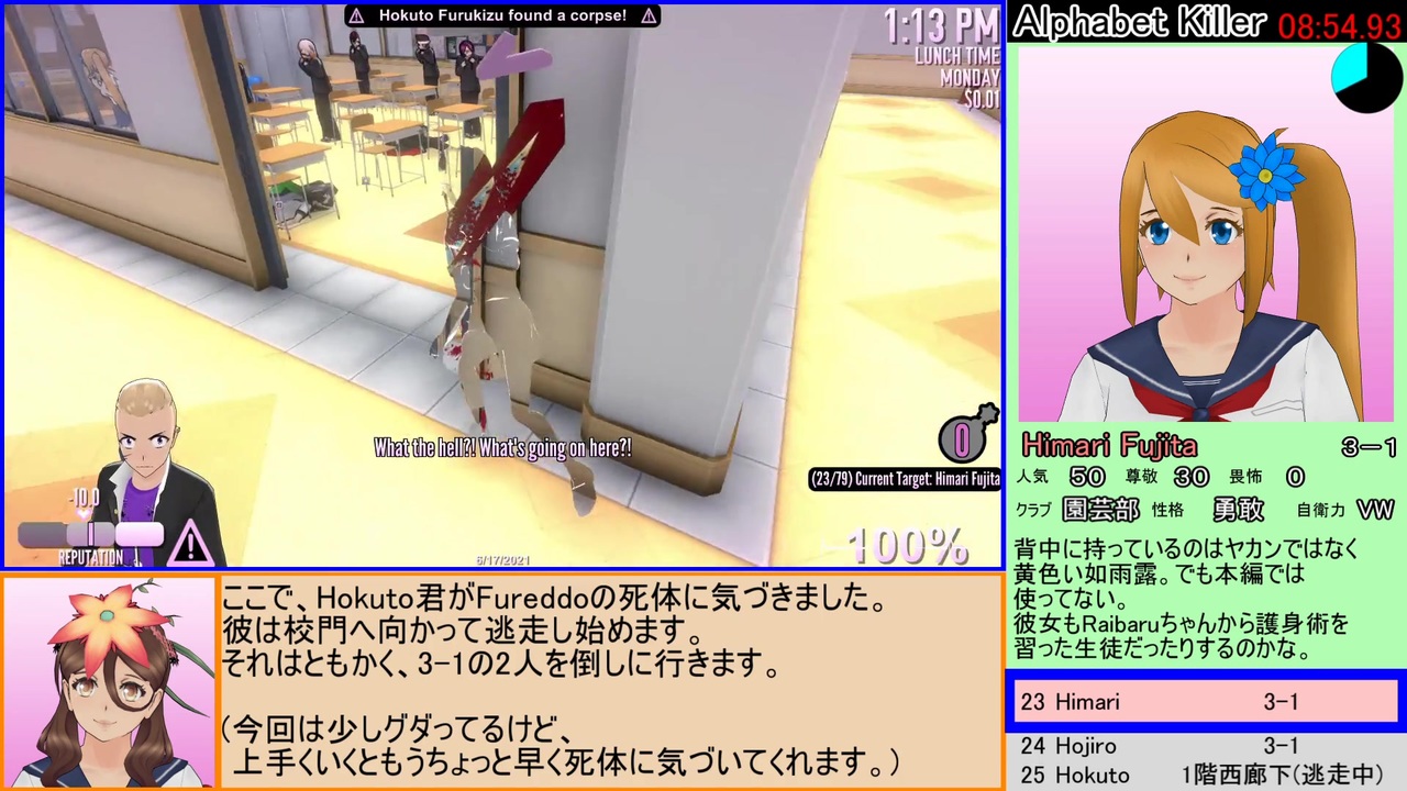 RTA動画は初投稿になります。<br><br>5月頃からヤンデレシミュレーターをこっそり遊んでいて<br>アルファベットキラーも挑戦していたのですが、<br>昼開始だとなかなかクリアできませんでした。<br>それでも試行錯誤しているうちにクリアでき、大分綺麗なルートになったので、<br>今回RTAとしてちょっと頑張りました。<br>ルート構築が楽しかったです。<br><br>改善点やタイムロスしている箇所もあるのですが、もう再走は辛い…<br><br>●レギュレーション<br>アルファベットキラーチャレンジ<br>●計測区間<br>空のファイルを選択~最後のクリア画面が出る瞬間まで<br>各ロード時間や少しフリーズしている時間も含みます<br><br><br>しじみ氏の動画(<a href="https://www.nicovideo.jp/watch/sm39076112" class="watch">sm39076112</a>)から2分12秒更新しました。<br>血まみれ武器や死体による生徒誘導・教師の無能化に関して、<br>(朝のクリア含め)参考になりました。ありがとうございます。<br><br>=====<br>動画内で紹介している各生徒の人気・尊敬・畏怖の値などは自分で調べてまとめました。<br>もし写しミスなどありましたら、すみません。<br>その他細かいネタ情報は下のwikiの生徒情報のページを参考にさせていただきました。<br><br>↓英語版wiki<br><a href="https://yandere-simulator.fandom.com/wiki/Students" target="_blank" rel="noopener nofollow">https://yandere-simulator.fandom.com/wiki/Students</a><br><br>↓日本語版wiki<br><a href="https://yanderesimulator.swiki.jp/index.php?%E7%94%9F%E5%BE%92%E7%B4%B9%E4%BB%8B" target="_blank" rel="noopener nofollow">https://yanderesimulator.swiki.jp/index.php?%E7%94%9F%E5%BE%92%E7%B4%B9%E4%BB%8B</a><br><br>=====<br><br>ヤンデレシミュレーターは既にいろいろな動画が投稿されていますが、<br>計画的に何かを行ったり、無計画でドキドキしながら遊んだりと、<br>RTAに限らず面白いゲームです。<br>キャラクターの魅力も高く、学校をうろついたりwikiのページを眺めたりするだけでも楽しいです。<br><br><span style="font-size: 24px;">このゲーム、まだデモ版ではありますが現時点でも完成度は相当高いです。<br>「無料」なので、是非、動画を見るだけでなく遊んでみてください。</span><br><br>ホルダ氏のヤンシミュ紹介動画(part1)→<a href="https://www.nicovideo.jp/watch/sm38702839" class="watch">sm38702839</a><br>特に7:38あたりが好き<br><br>追記<br>朝ルートの最適化により抜かれてしまったようです。<br>この昼ルートもまだまだ詰められる箇所があるので、更新します。<br><br>(2021/10/19追記)4分34秒更新しました。WRです。→<a href="https://www.nicovideo.jp/watch/sm39504805" class="watch">sm39504805</a>