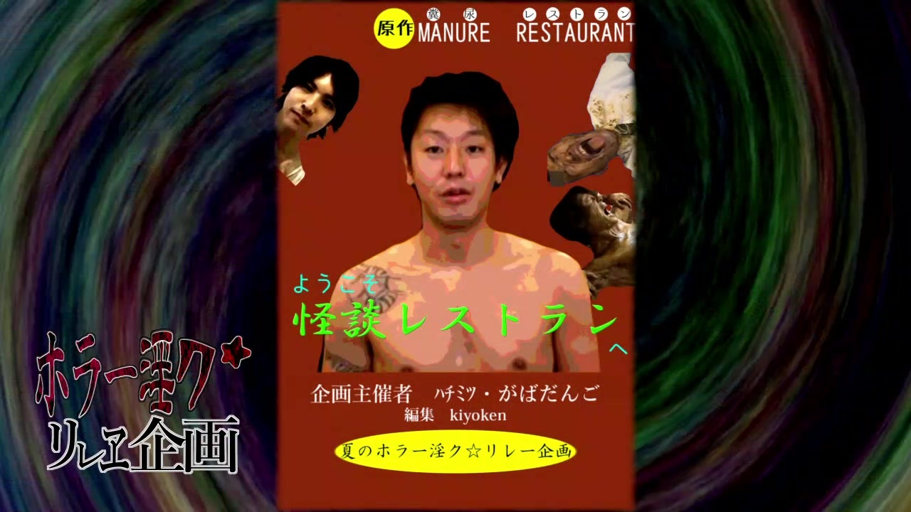 期待している皆様、残念ながら食糞要素はありません<br>(追記)誤字が発生しているのは使用です いくら誤字を見つけられたかな?(すみませんでした)<br><br>ホラー淫ク☆<br>リレヱ企画<br>--------------------------------------------------------------------------------<br><br>企画:がばだんご兄貴 ハチミツ兄貴<br><br>予告動画:Nahl兄貴<br><br>--------------------------------------------------------------------------------<br>昨日の動画:<a href="https://www.nicovideo.jp/watch/sm39215103" class="watch">sm39215103</a>(首長族様)<br> <a href="https://www.nicovideo.jp/watch/sm39244007" class="watch">sm39244007</a>(NOVALT様)<br><br>今日の動画:こ↑こ↓(kiyoken)<br> <a href="https://www.nicovideo.jp/watch/sm39232776" class="watch">sm39232776</a>(ダイセロン様)<br><br>明日の動画:<a href="https://www.nicovideo.jp/watch/sm39239771" class="watch">sm39239771</a>(ロリス様)<br> <a href="https://www.nicovideo.jp/watch/sm39237609" class="watch">sm39237609</a>(三次関数様)<br>--------------------------------------------------------------------------------<br><br>企画マイリスト : <a href="https://sp.nicovideo.jp/mylist/71471988" target="_blank" rel="noopener nofollow">https://sp.nicovideo.jp/mylist/71471988</a>