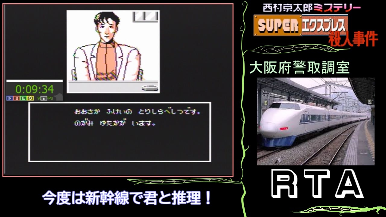 約3年ほど前に投稿した西村京太郎の<br>ミステリー小説のゲーム日2作目の<br>リアルタイムアタック動画(<a href="https://www.nicovideo.jp/watch/sm34072368" class="watch">sm34072368</a>)(speedrun)に<br>ゆっくり編集を加えたものです。<br><br>ゲームスタート~第2の殺人発生までです。<br><br>前作のブルートレイン殺人事件 <a href="https://www.nicovideo.jp/watch/sm35753780" class="watch">sm35753780</a> の<br>1ヶ月後に走ったのに、動画編集に取り掛かったのは<br>前作の編集動画完走からその2年後でした。<br><br>今回から、ケムリクサのりんと<br>へんたつ猫の掛け合い方式に挑んでみました。<br><br>ちゃんとストーリーを把握してもらえるだろうか?<br><br>Part2 <a href="https://www.nicovideo.jp/watch/sm39235788" class="watch">sm39235788</a><br><br>たぶちさんち様、れうすき様、チャリ様、kuro様、hirohiro2929様、POST様、voidmay様、Lui様、食べるカツどん様、CAFE様、ニース様、ぼたもち様、normadz様、ひょん様、@(´・ω・`)様、匿名様、マーモ様、denimu様、saru121様、tatibana様、ゲリー様、さぶろっそ様、くらば様、勇者ああああ様、甲烏賊様、れく様、広告ありがとうございました。<br><br />マイリスト <a href="https://www.nicovideo.jp/mylist/60410734" target="_blank" rel="noopener">mylist/60410734</a><br>Part1リンク <a href="https://www.nicovideo.jp/mylist/34191346" target="_blank" rel="noopener">mylist/34191346</a><br><br>めし太郎の質問箱です。 <a href="https://peing.net/ja/shamojiotoko" target="_blank" rel="noopener nofollow">https://peing.net/ja/shamojiotoko</a><br>ツイッター @KoshigiYuji(凍結中)、@shamojiotoko<br><br>チャート置き場を作りました。<br><a href="https://t.co/maEiFIAXy0?amp=1" target="_blank" rel="noopener nofollow">https://t.co/maEiFIAXy0?amp=1</a>