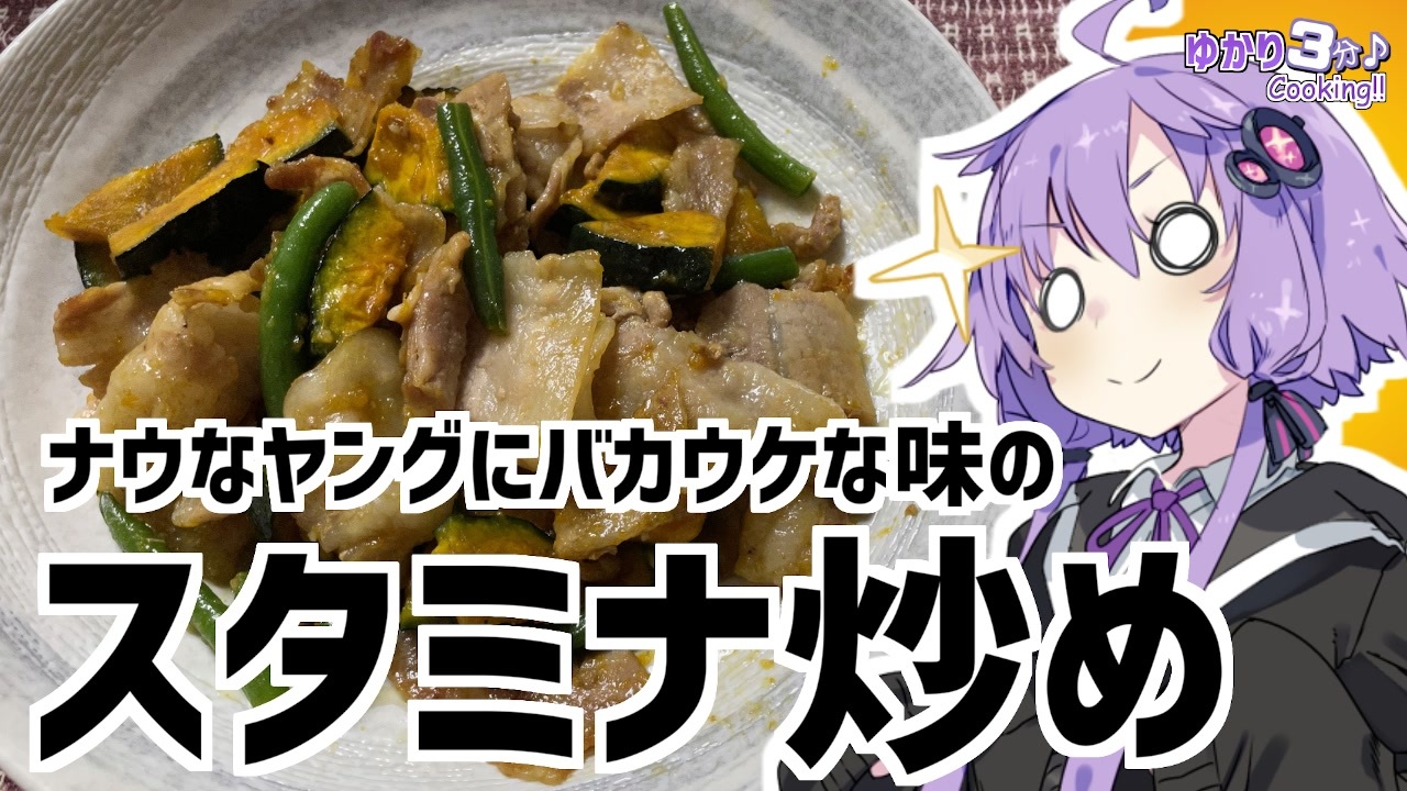 結月ゆかりを使用した料理動画です<br><br>スタミナ炒め作りました!<br>カボチャが食べたくて作りました。夏のカボチャは美味しいですね。<br><br>私のゴジラ初体験の感想は『いいね!』を押して確認してくれよな!<br><br>今回使用した材料<br>豚バラ:150g カボチャ:100g<br>インゲン:6本 めんつゆ(4倍濃縮):大さじ3<br>砂糖:小さじ2 ニンニク:小さじ1<br>ごま油:適量<br><br>ナスと鶏むね肉のピリ辛ケチャップ炒め:<a href="https://www.nicovideo.jp/watch/sm39234285" class="watch">sm39234285</a><br>ゲーミングゆかりんを楽しみたい人向け10秒動画祭の動画:<a href="https://www.nicovideo.jp/watch/sm39188156" class="watch">sm39188156</a><br>蹴上の絶景お花見スポット!JK旅:<a href="https://www.nicovideo.jp/watch/sm38890137" class="watch">sm38890137</a><br><br>オススメのボイロ劇場<br>茜ちゃんと葵ちゃんの現代怪異占い:<a href="https://www.nicovideo.jp/watch/sm38263500" class="watch">sm38263500</a><br><br>ツイッター:<a href="https://twitter.com/mrt89244817" target="_blank" rel="noopener nofollow">https://twitter.com/mrt89244817</a>