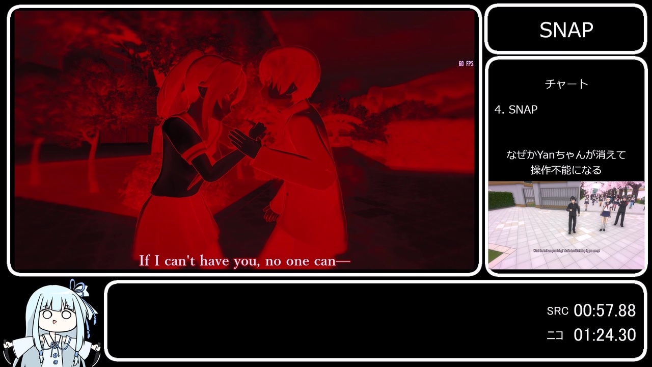 声色を少し変えたので初投稿です。<br>A.I.VOICEを使用しています。ご了承ください。<br>ほんへが解説することなさすぎてかえって忙しくなったパターン<br><br><strong><u>レギュレーション<br>毒殺エンド(Poison)でゲームクリア/SNAPエンド達成<br>計測区間:空ファイル選択~エンドロール開始まで/空ファイル選択~自決まで<br>Speedrun仕様(SRC)…ロード時間は計測しない<br>ニコニコ仕様…ロード時間も計測</u></strong><br><br>Speedrun仕様のタイマー付けただけ版<br>毒殺エンド→<a href="https://youtu.be/hKirC7rpH5Y" target="_blank" rel="noopener nofollow">https://youtu.be/hKirC7rpH5Y</a><br>SNAP→<a href="https://youtu.be/BuoUQEKEhjk" target="_blank" rel="noopener nofollow">https://youtu.be/BuoUQEKEhjk</a><br><br>先駆者様<br>・毒殺エンド<br>Ri__________n兄貴→<a href="https://www.nicovideo.jp/watch/sm39103329" class="watch">sm39103329</a><br>いりゅーしん兄貴→<a href="https://www.nicovideo.jp/watch/sm39090397" class="watch">sm39090397</a><br>ghost粉兄貴→<a href="https://www.nicovideo.jp/watch/sm39070110" class="watch">sm39070110</a><br>・SNAP<br>レモンあめ兄貴→<a href="https://www.nicovideo.jp/watch/sm39022648" class="watch">sm39022648</a><br>芹香兄貴→<a href="https://www.nicovideo.jp/watch/sm39113411" class="watch">sm39113411</a>、<a href="https://www.nicovideo.jp/watch/sm39115925" class="watch">sm39115925</a>、<a href="https://www.nicovideo.jp/watch/sm39136057" class="watch">sm39136057</a><br><br>そのほか動画内で触れた他走者様<br>LABO兄貴→<a href="https://www.nicovideo.jp/watch/sm39062897" class="watch">sm39062897</a>(専用キル1)、<a href="https://www.nicovideo.jp/watch/sm38937499" class="watch">sm38937499</a>(Horuda心中)<br>閉廷兄貴のシリーズ→<a href="https://www.nicovideo.jp/series/241725" target="_blank" rel="noopener">series/241725</a><br>にんどう兄貴→<a href="https://www.nicovideo.jp/watch/sm39242305" class="watch">sm39242305</a>(Osana2回排除)<br><br>Midori Forest紹介動画→<a href="https://youtu.be/glUqyZ2UpqY" target="_blank" rel="noopener nofollow">https://youtu.be/glUqyZ2UpqY</a><br><br>前→<a href="https://www.nicovideo.jp/watch/sm39195907" class="watch">sm39195907</a><br>次→<a href="https://www.nicovideo.jp/watch/sm39342805" class="watch">sm39342805</a><br>RTAマイリス→<a href="https://www.nicovideo.jp/mylist/74656323" target="_blank" rel="noopener">mylist/74656323</a><br><br>お借りした素材はコンテンツツリーをご覧ください。