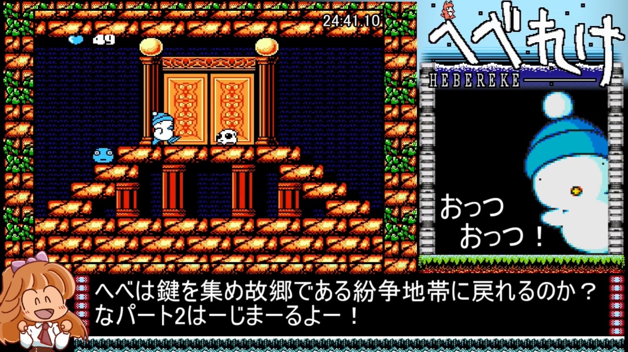ガバは一切無いので初投稿です。<br>バーチャルコンソールかprojectEGGでみんなも買おう!!!!!<br>※ネタバレあり!<br><br>次作→<a href="https://www.nicovideo.jp/watch/sm39333760" class="watch">sm39333760</a> (おでかけレスターれれれのれ(^^;)<br>前パート→<a href="https://www.nicovideo.jp/watch/sm39266945" class="watch">sm39266945</a>(へべれけパート1)<br>自作RTA→<a href="https://www.nicovideo.jp/mylist/66567417" target="_blank" rel="noopener">mylist/66567417</a><br><br>レギュレーション<br>計測開始:スタートボタンを押した瞬間<br>計測終了:ラスボスのうにょーんを倒した瞬間<br>環境:レトロフリーク・GV-USB 3.0・スーパーファミコンコントローラー・アマレコTV4<br /><br><span style="font-size: 18px;"><strong>↓</strong></span><span style="color: #ff0000; font-size: 18px;"><strong>生放送(毎日20時~24時くらい)</strong></span><br><span style="font-size: 18px;"><strong><a href="https://www.twitch.tv/yuyukichi2" target="_blank" rel="noopener nofollow">https://www.twitch.tv/yuyukichi2</a><br>↓</strong></span><span style="color: #0000ff; font-size: 18px;"><strong>ツイッター</strong></span><br><span style="font-size: 18px;"><strong><a href="https://twitter.com/YuyukichiRTA" target="_blank" rel="noopener nofollow">https://twitter.com/YuyukichiRTA</a><br>↓</strong></span><span style="color: #ff9900; font-size: 18px;"><strong>ホームページ</strong></span><br><span style="font-size: 18px;"><strong><a href="https://yuyukichirta.wixsite.com/yuyukichi" target="_blank" rel="noopener nofollow">https://yuyukichirta.wixsite.com/yuyukichi</a></strong></span>