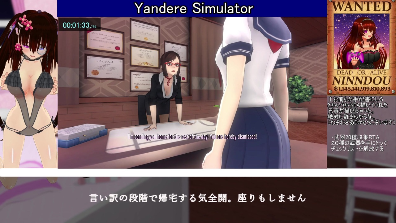 超スピード(レ) <br><br>21/09/06追記:SpeedRunヤンシミュ全レギュ日本一色になった模様(登録のない100%は除く)<br>→<a href="https://www.speedrun.com/yansim" target="_blank" rel="noopener nofollow">https://www.speedrun.com/yansim</a><br><span style="font-size: 24px;">追記:デバイス制限喰らいました(無念)</span> <br><br><strong><u>~計測区間/レギュ~<br>◆SpeedRun.com基準<br>◆空ファイル選択時~武器収集後の就寝時点<br>◆ピンク色操作説明ロード画面中のみタイマー一時停止</u></strong><br><br><br>閉廷兄貴のバッドガイ→<a href="https://www.nicovideo.jp/watch/sm39255064" class="watch">sm39255064</a><br>アサリ兄貴の武器20種→<a href="https://www.nicovideo.jp/watch/sm39142835" class="watch">sm39142835</a><br>LABO兄貴の最新動画→<a href="https://www.nicovideo.jp/watch/sm39251899" class="watch">sm39251899</a><br><br>ファンアートくれた方のピクシブ→<a href="https://www.pixiv.net/users/20490965" target="_blank" rel="noopener nofollow">https://www.pixiv.net/users/20490965</a><br><br>RTAマイリス⇒<a href="https://www.nicovideo.jp/mylist/69428960" target="_blank" rel="noopener">mylist/69428960</a><br><br>