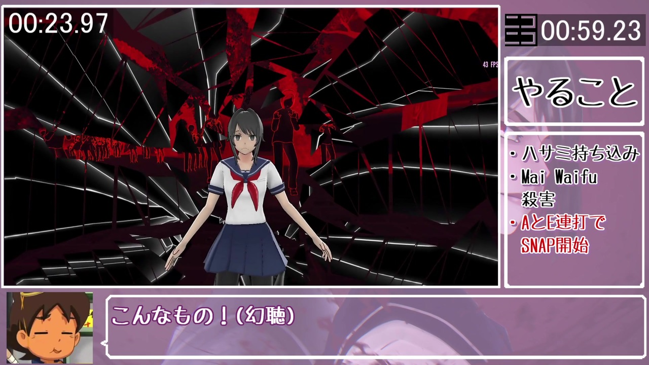 4回目の初投稿です。<br>(申請が通れば)SNAPのWR更新です。やったぜ!<br><br>動画で使ったゆっくりYanちゃん配布→<a href="https://seiga.nicovideo.jp/seiga/im10807548" target="_blank" rel="noopener">im10807548</a><br><br>←前(<a href="https://www.nicovideo.jp/watch/sm39246562" class="watch">sm39246562</a>) 次(未定)→<br><br>~~~~~~~~~~~~~~~~~~~~<br><span style="font-size: 18px;">SNAP RTA <a href="#" class="seekTime" data-seekTime="00:23" onclick="seekNicoPlayer('#00:23'); return false;">#00:23</a>~</span><br><br>【レギュレーション】<br><strong><u>・新規ファイル選択~Ayanoが自害するまで<br>・ニコニコ基準はタイマーポーズなし、Speedrun.com基準はロード時間でポーズ<br>・SNAPモードでSenpaiを殺害する</u></strong><br><br>先駆者様 ☞ <i><a href="https://www.nicovideo.jp/watch/sm39022648" class="watch">sm39022648</a></i> (レモンあめ兄貴)<br> ☞ <i><a href="https://www.nicovideo.jp/watch/sm39113411" class="watch">sm39113411</a>,<a href="https://www.nicovideo.jp/watch/sm39115925" class="watch">sm39115925</a>,<a href="https://www.nicovideo.jp/watch/sm39136057" class="watch">sm39136057</a>,<a href="https://www.nicovideo.jp/watch/sm39151113" class="watch">sm39151113</a></i> (芹香兄貴)<br> ☞ <i><a href="https://www.nicovideo.jp/watch/sm39251567" class="watch">sm39251567</a></i> (しじみ兄貴)<br><br>無編集 ☞ <i><a href="https://www.youtube.com/watch?v=V8cgTfCLKe4" target="_blank" rel="noopener nofollow">https://www.youtube.com/watch?v=V8cgTfCLKe4</a></i><br><br>~~~~~~~~~~~~~~~~~~~~<br><span style="font-size: 18px;">パンツコンプRTA <a href="#" class="seekTime" data-seekTime="02:30" onclick="seekNicoPlayer('#02:30'); return false;">#02:30</a>~</span><br><br>【レギュレーション】<br><strong><u>・新規ファイル選択~帰宅後就寝時まで<br>・ニコニコ基準はタイマーポーズなし、Speedrun.com基準はロード時間でポーズ<br>・実装されているパンツ全12種類をコンプリートする</u></strong><br><br>先駆者様 ☞ <i><a href="https://www.nicovideo.jp/watch/sm39146434" class="watch">sm39146434</a></i> (いりゅーしん28@二代目兄貴)<br> ☞ <i><a href="https://twitter.com/koisi0319vt/status/1424363354064183298?s=20" target="_blank" rel="noopener nofollow">https://twitter.com/koisi0319vt/status/1424363354064183298?s=20</a></i> (雛石 小石兄貴)<br><br>【追記】<br>Nep兄貴の検証によると、Panty Queenは初期パンツ+店パンツ9枚を購入すれば解禁されるようです。<br><s>ドステロチルドレン</s>いりゅーしん28兄貴がチェックリスト解禁RTAとして走り直すらしいので、そのうち再走します。<br><br>~~~~~~~~~~~~~~~~~~~~<br><span style="font-size: 18px;">おまけ <a href="#" class="seekTime" data-seekTime="05:23" onclick="seekNicoPlayer('#05:23'); return false;">#05:23</a>~</span><br>内容:Senpai浮遊バグ、生徒会のルーチン紹介など<br /><br>~~~~~~~~~~~~~~~~~~~~<br>【Twitter】<i><a href="https://twitter.com/Chika_ncnc" target="_blank" rel="noopener nofollow">https://twitter.com/Chika_ncnc</a></i><br>【Youtube】<i><a href="https://www.youtube.com/channel/UC3n5nu2RaKOcPxjf4erIvFQ" target="_blank" rel="noopener nofollow">https://www.youtube.com/channel/UC3n5nu2RaKOcPxjf4erIvFQ</a></i>