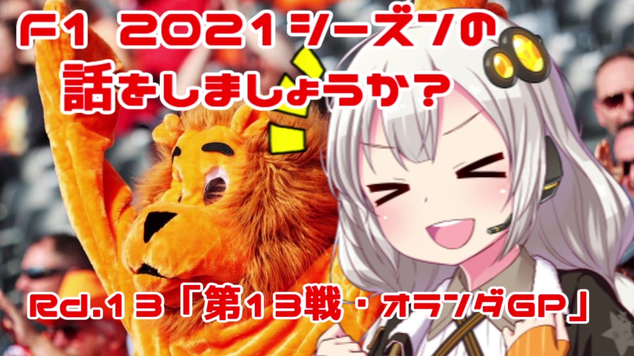 「オレンジ成分たっぷり!」by紲星あかり<br><br><br>おはこんばんちは、紲星あかりです。<br>この動画は、F1 2021年シーズンをダイジェストでお送りしています。<br>第13回目は第13戦・オランダGPをお送りします。<br>1985年以来、36年ぶりの開催となるM・フェルスタッペンの母国・オランダ。<br>「オレンジ軍団」と呼ばれる熱狂的なファンの後押しで彼は地元で初優勝することができたのでしょうか?<br><br><br><br><br><br><br><br><span style="color: red;">(ご注意)この動画の情報は真実とは限りません。また、誤字・脱字が含まれる場合があります。ご了承ください。</span><br><br>前→第12戦・ベルギーGP <a href="https://www.nicovideo.jp/watch/sm39267291" class="watch">sm39267291</a><br>次→第14戦・イタリアGP <a href="https://www.nicovideo.jp/watch/sm39338885" class="watch">sm39338885</a><br><br><br> <br>F12021シーズンの話をしましょうか?マイリスト→<a href="https://www.nicovideo.jp/mylist/70735663" target="_blank" rel="noopener">mylist/70735663</a><br><br>うp主のF1動画シリーズ<br>F12020シーズンの話をしましょうか?マイリスト→<a href="https://www.nicovideo.jp/mylist/67651731" target="_blank" rel="noopener">mylist/67651731</a> <br><span style="color: #000000; font-size: 14px;">F12019シーズンの話をしましょうか?マイリスト</span><span style="color: #000000; font-size: 13px;">→</span><a href="https://www.nicovideo.jp/mylist/64678414" target="_blank" rel="noopener">mylist/64678414</a><br><span style="color: #000000; font-size: 14px;">F12018シーズンの話をしましょうか?マイリスト</span><span style="color: #000000; font-size: 13px;">→</span><a href="https://www.nicovideo.jp/mylist/61514606" target="_blank" rel="noopener">mylist/61514606</a><br>F1の話をしましょうか?マイリスト→<a href="https://www.nicovideo.jp/mylist/40499353" target="_blank" rel="noopener">mylist/40499353</a><br>F1の話をしましょうか?OPフルバージョン→<a href="https://www.nicovideo.jp/mylist/59030210" target="_blank" rel="noopener">mylist/59030210</a><br>F1 CM集→<a href="https://www.nicovideo.jp/mylist/57297507" target="_blank" rel="noopener">mylist/57297507</a><br><br>