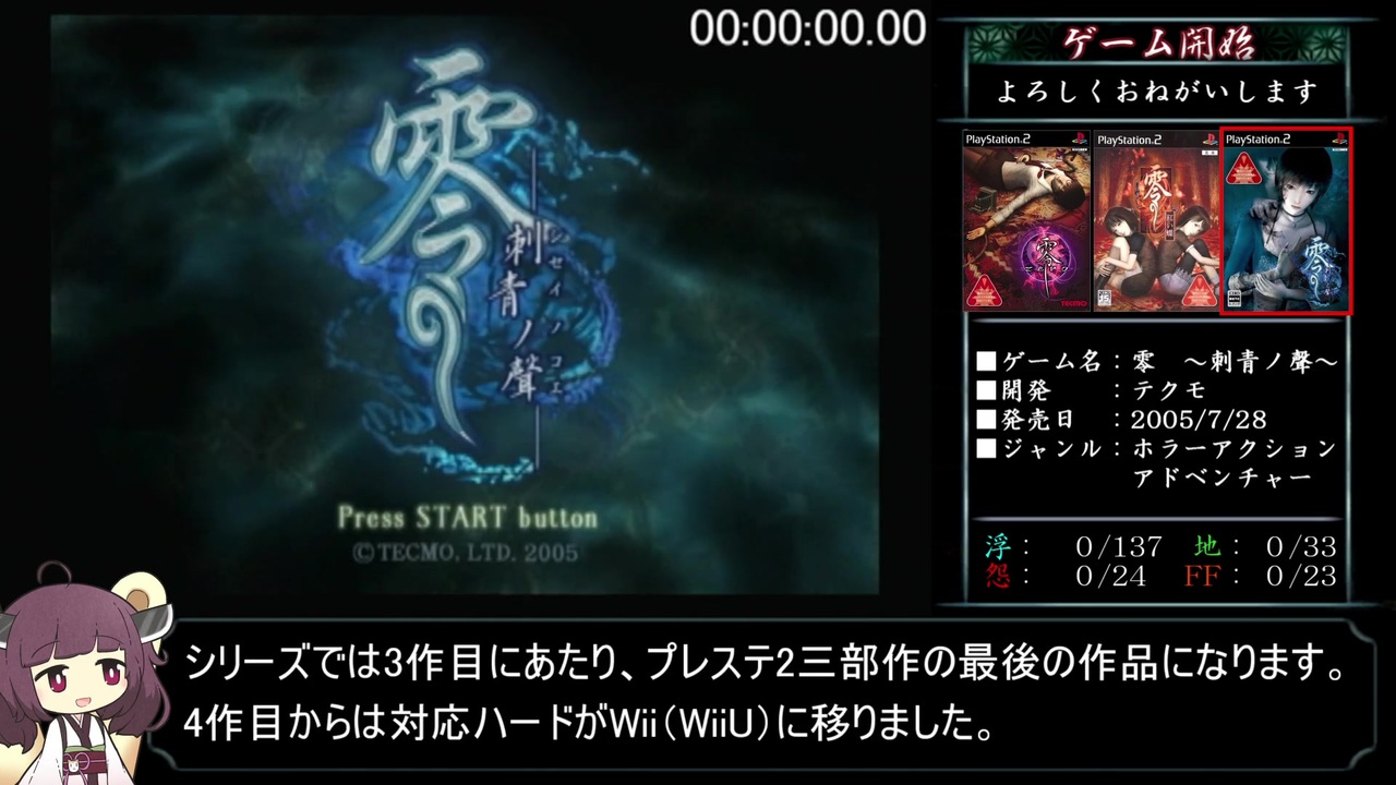 お久しぶりです。RTA第2弾になります。<br><br>今回は試しに、汚い素材を使わずに編集してみました。<br>(今後どうするかは)知らなーい<br><br>タイマースタート~二ノ刻終了まで<br><br>ないです←前|<a href="https://www.nicovideo.jp/mylist/71775161" target="_blank" rel="noopener">mylist/71775161</a>|次→<a href="https://www.nicovideo.jp/watch/sm39346079" class="watch">sm39346079</a><br><br>RTA part1集 <a href="https://www.nicovideo.jp/mylist/71936684" target="_blank" rel="noopener">mylist/71936684</a><br><br><strong><u>▼参考サイト様等</u></strong><br>・攻略フルーツ - 零 刺青の聲 - <a href="https://xn--cool-kk4csd1lrc8dvi.xyz/zero-koe/" target="_blank" rel="noopener nofollow">https://xn--cool-kk4csd1lrc8dvi.xyz/zero-koe/</a><br>・零~刺青ノ聲~ 公式完全攻略本 導魂之書 - 株式会社エンターブレイン<br><br><strong><u>▼お借りした素材達</u></strong><br>・【akihiyo様】:立ち東北きりたん素材 - <a href="https://seiga.nicovideo.jp/seiga/im10601764" target="_blank" rel="noopener">im10601764</a><br>・【hiropon様】:指さし棒 - <a href="https://commons.nicovideo.jp/works/nc190353" target="_blank" rel="noopener">nc190353</a><br>・【公式様】:東北ずん子のイラスト/3Dデータ - <a href="https://zunko.jp/con_illust.html" target="_blank" rel="noopener nofollow">https://zunko.jp/con_illust.html</a><br><br><strong><u>▼プレイ環境</u></strong><br>・本体(実機):SCPH-30000<br>・コントローラ:SCPH-10010<br>・ディスク:廉価版のやつ<br><br><strong><u>▼レギュレーション/縛り等</u></strong><br>・計測開始:1周目開始時New GameからNormalを選択した瞬間<br>・計測終了:2周目終了時リザルト画面にて「霊リスト:217/217」が表示された瞬間<br>・難易度は2周ともNormal<br>・エンディングは2周ともノーマルエンド<br>・バグ技はなんでもあり