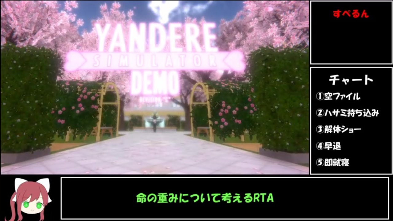 動画の編集環境変わったので初投稿です。動画で触れ忘れてましたが30回ほど走ってもヤンちゃんの笑みが漏れてチャートが狂うことはほぼ無かったので安心してください。長く辛い戦いだった…。<br><br>こっちも見て → <a href="https://www.nicovideo.jp/watch/sm39309881" class="watch">sm39309881</a><br><br><br>前回 → <a href="https://www.nicovideo.jp/watch/sm39269967" class="watch">sm39269967</a><br>次回 → <a href="https://www.nicovideo.jp/watch/sm39341508" class="watch">sm39341508</a><br>マイリス <a href="https://www.nicovideo.jp/mylist/71462031" target="_blank" rel="noopener nofollow">https://www.nicovideo.jp/mylist/71462031</a><br><br><br>※注意<br>ゆっくり実況<br>ガバプレイ<br>淫夢要素はないです<br><br><br>タイマー開始 : 空ファイル選択<br>タイマー停止 : スキップ表示<br>ルール : クソ重(ピンク画面)は計測外、生徒を10人解体する<br><br><br>先々々駆者様 <a href="https://www.nicovideo.jp/watch/sm38880875" class="watch">sm38880875</a><br>先々駆者様 <a href="https://www.nicovideo.jp/watch/sm39204850" class="watch">sm39204850</a><br>先駆者様 <a href="https://www.nicovideo.jp/watch/sm39220471" class="watch">sm39220471</a><br><br><br>文芸部神社 <a href="https://www.nicovideo.jp/watch/sm32686790" class="watch">sm32686790</a><br>アイキャッチ神社 <a href="https://www.nicovideo.jp/watch/sm19396471" class="watch">sm19396471</a><br>うなぎだれ先輩 <a href="https://seiga.nicovideo.jp/seiga/im10794067" target="_blank" rel="noopener">im10794067</a>
