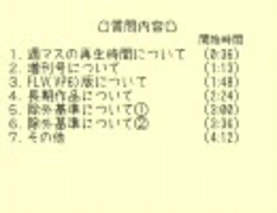 ◆よりよい番組づくりのため、アンケートへのご協力をお願いします。<br />アンケート集計期間:7月12日〜18日<br />◆集計は既に締め切っております。ご協力ありがとうございました。<br />◆集計結果をこちら(<a href="https://www.nicovideo.jp/watch/sm4297353" class="watch">sm4297353</a>)にて公開しております。<br /><br />◆アンケート項目<br />1.週マスの再生時間について(0:36)<br />2.増刊号について(1:13)<br />3.FLV(VP6)版について(1:48)<br />4.長期作品について(2:24)<br />5.除外基準について1(3:00)<br />6.除外基準について2(3:36)<br />7.その他(4:12)<br /><br />◆関連リンクナビ<br />7月第1週H.264版[<a href="https://www.nicovideo.jp/watch/sm3859734" class="watch">sm3859734</a>]/増刊[<a href="https://www.nicovideo.jp/watch/sm3864866" class="watch">sm3864866</a>]<br />7月第2週H.264版[<a href="https://www.nicovideo.jp/watch/sm3931653" class="watch">sm3931653</a>]/増刊[<a href="https://www.nicovideo.jp/watch/sm3931965" class="watch">sm3931965</a>]<br /><br />