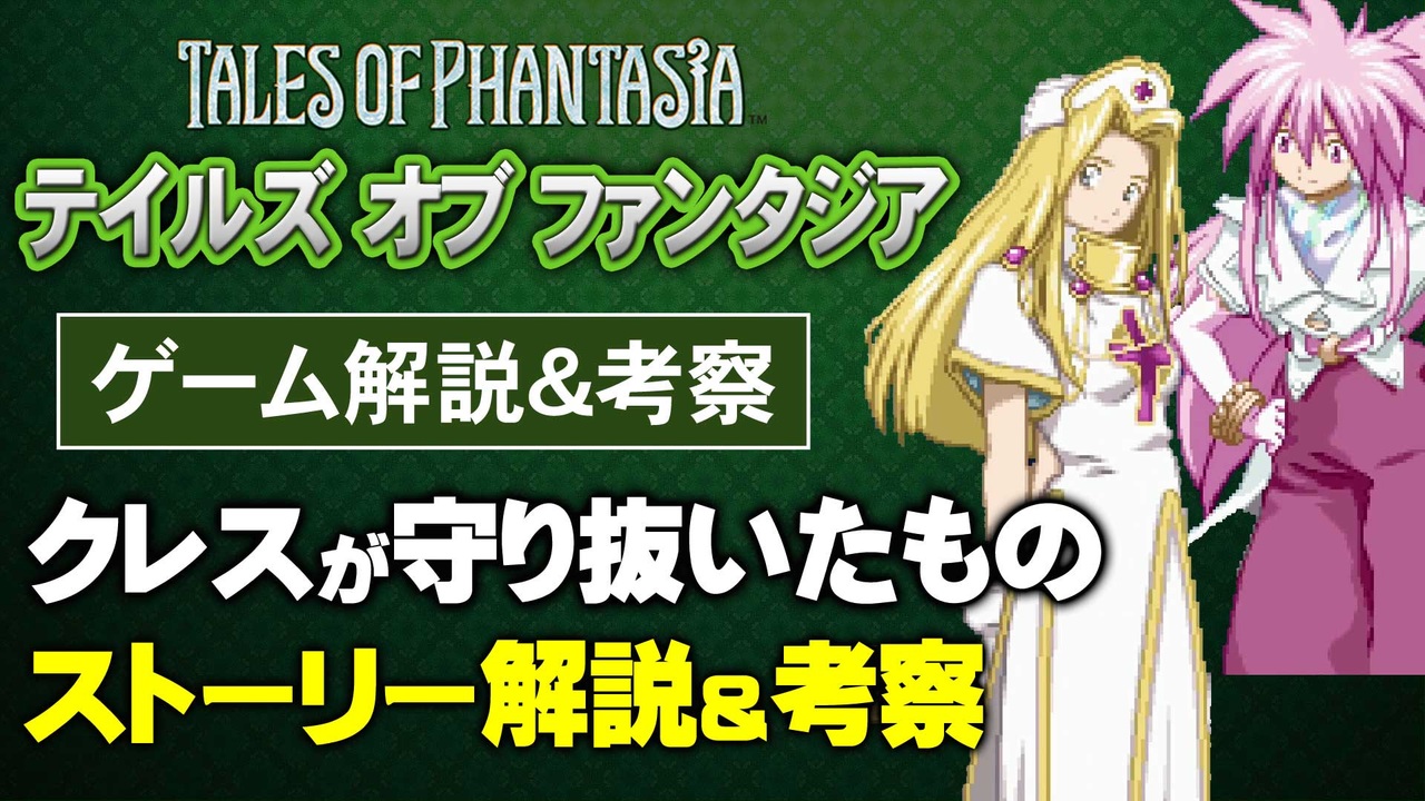 過去動画を宣伝して下さった皆さん、ありがとうございましたm(__)m<br>毎回ひとつのゲームを取り上げ、3つのテーマから解説&考察します。<br>【前編】は毎月1日・15日更新、【後編】は制作状況に応じて更新致します。<br><br><strong>▼第105回「テイルズオブファンタジア」</strong><br>前編:<a href="https://www.nicovideo.jp/watch/sm39274079" class="watch">sm39274079</a><br><br>***************************************************************<br><span style="color: #262626;"><strong>▼訂正とお詫び</strong></span><br>動画終盤で、ミラルドのことを妻と言っていますが、<br>正しくはクラースの「幼馴染で恋人」なのだそうです。失礼いたしましたm(__)m<br><br><span style="color: #262626;"><strong>▼補足</strong></span><br>今回は「中編」の動画で、他の作品と明確な差別化を図った、<br>戦闘システムの魅力についてお話しする予定でした。<br><br>ただ、スーファミ版とリメイク版では、システムや難易度が異なるなど、<br>解説としてまとめるのが困難だったため、<br>残念ながら断念することにしました。申し訳ございませんm(__)m<br>**************************************************************<br><br>■youtubeはこちら <a href="https://youtu.be/qCTl_TCPMNk" target="_blank" rel="noopener nofollow">https://youtu.be/qCTl_TCPMNk</a><br>■ゲーム夜話ツイッター <a href="https://twitter.com/gameyawa" target="_blank" rel="noopener nofollow">https://twitter.com/gameyawa</a><br><br>■第104回「テトリス」<br>前編:<a href="https://www.nicovideo.jp/watch/sm39188323" class="watch">sm39188323</a> 中編:<a href="https://www.nicovideo.jp/watch/sm39202071" class="watch">sm39202071</a> 後編:<a href="https://www.nicovideo.jp/watch/sm39228198" class="watch">sm39228198</a><br>■第106回「ロックマンエグゼ」<br>前編:<a href="https://www.nicovideo.jp/watch/sm39339976" class="watch">sm39339976</a><br><br>■ゲーム夜話マイリスト <a href="https://www.nicovideo.jp/mylist/56973971" target="_blank" rel="noopener">mylist/56973971</a>