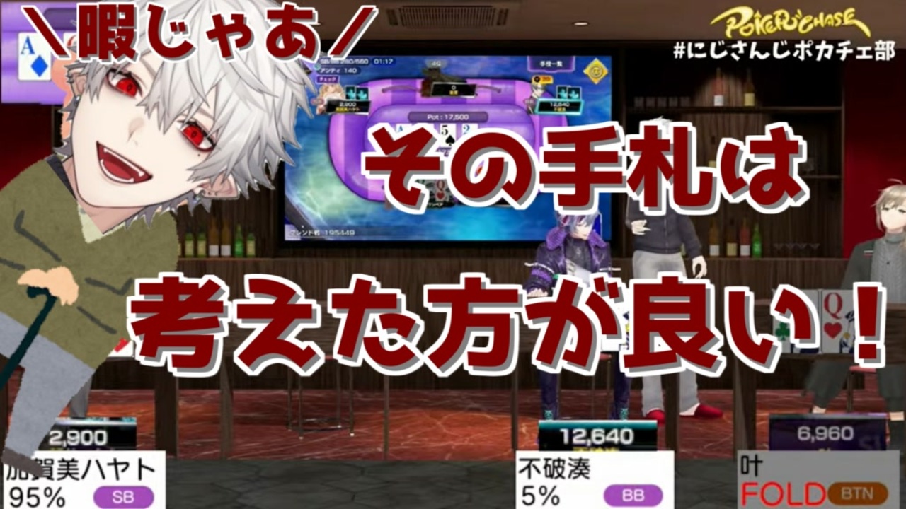 どの手でも考えるべきなんだよなぁ<br><br>【#にじさんじポカチェ部】負け犬は誰だ?-Who is the Loser?-【#ポーカーチェイス】<br><a href="https://www.youtube.com/watch?v=Hfx4euxUrlo" target="_blank" rel="noopener nofollow">https://www.youtube.com/watch?v=Hfx4euxUrlo</a><br><br>かなかなちゃんねる<br><a href="https://www.youtube.com/channel/UCspv01oxUFf_MTSipURRhkA" target="_blank" rel="noopener nofollow">https://www.youtube.com/channel/UCspv01oxUFf_MTSipURRhkA</a><br>社長<br><a href="https://www.youtube.com/channel/UCmovZ2th3Sqpd00F5RdeigQ" target="_blank" rel="noopener nofollow">https://www.youtube.com/channel/UCmovZ2th3Sqpd00F5RdeigQ</a><br>ホスト<br><a href="https://www.youtube.com/channel/UC6wvdADTJ88OfIbJYIpAaDA" target="_blank" rel="noopener nofollow">https://www.youtube.com/channel/UC6wvdADTJ88OfIbJYIpAaDA</a><br>にじポカチェ部の敗北者<br><a href="https://www.youtube.com/channel/UCSFCh5NL4qXrAy9u-u2lX3g" target="_blank" rel="noopener nofollow">https://www.youtube.com/channel/UCSFCh5NL4qXrAy9u-u2lX3g</a><br />広告、いいね、コメント、マイリス等本当にありがとうございます。<br>日々、励みになっております<br><br>YouTubeでも動画を投稿していますので<br>チャンネル登録などして下さったらむせび泣きます。<br><a href="https://www.youtube.com/channel/UCyuUQrl4s1Karwhp-emTX5g" target="_blank" rel="noopener nofollow">https://www.youtube.com/channel/UCyuUQrl4s1Karwhp-emTX5g</a><br>ご要望などあればTwitterまでお願いします<br><a href="https://twitter.com/noktube" target="_blank" rel="noopener nofollow">https://twitter.com/noktube</a><br><br>使用楽曲や音源<br>DOVA-SYNDROME様<br><a href="https://dova-s.jp/" target="_blank" rel="noopener nofollow">https://dova-s.jp/</a><br>騒音の無い世界様<br><a href="https://noiselessworld.net/" target="_blank" rel="noopener nofollow">https://noiselessworld.net/</a><br>効果音ラボ様<br><a href="https://soundeffect-lab.info/" target="_blank" rel="noopener nofollow">https://soundeffect-lab.info/</a><br>ニコニコモンズ素材