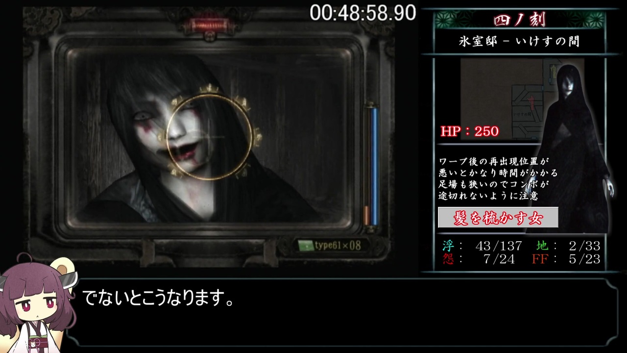 きりたんに「雛咲深紅」を無調整で読ませたら、<br>「ヒヨコサキシンク」と読んで、編集中にコーヒーを吹き出しました。<br><br>※前回想像以上に物足りなかったので、<br>今回からちょこちょこ語録を入れていくことにしました。許しは請わぬ<br><br>三ノ刻開始~四ノ刻終了まで<br><br><a href="https://www.nicovideo.jp/watch/sm39305658" class="watch">sm39305658</a>←前|<a href="https://www.nicovideo.jp/mylist/71775161" target="_blank" rel="noopener">mylist/71775161</a>|次→<a href="https://www.nicovideo.jp/watch/sm39379666" class="watch">sm39379666</a><br><br>RTA part1集 <a href="https://www.nicovideo.jp/mylist/71936684" target="_blank" rel="noopener">mylist/71936684</a><br><br><strong><u>▼参考サイト様等</u></strong><br>・攻略フルーツ - 零 刺青の聲 - <a href="https://xn--cool-kk4csd1lrc8dvi.xyz/zero-koe/" target="_blank" rel="noopener nofollow">https://xn--cool-kk4csd1lrc8dvi.xyz/zero-koe/</a><br>・零~刺青ノ聲~ 公式完全攻略本 導魂之書 - 株式会社エンターブレイン<br><br><strong><u>▼お借りした素材達</u></strong><br>・【akihiyo様】:立ち東北きりたん素材 - <a href="https://seiga.nicovideo.jp/seiga/im10601764" target="_blank" rel="noopener">im10601764</a><br>・【hiropon様】:指さし棒 - <a href="https://commons.nicovideo.jp/works/nc190353" target="_blank" rel="noopener">nc190353</a><br>・【日真ってる仁様】:真顔のあかりちゃん - <a href="https://seiga.nicovideo.jp/seiga/im9387108" target="_blank" rel="noopener">im9387108</a><br>・【公式様】:東北ずん子のイラスト/3Dデータ - <a href="https://zunko.jp/con_illust.html" target="_blank" rel="noopener nofollow">https://zunko.jp/con_illust.html</a><br><br><strong><u>▼プレイ環境</u></strong><br>・本体(実機):SCPH-30000<br>・コントローラ:SCPH-10010<br>・ディスク:廉価版のやつ<br><br><strong><u>▼レギュレーション/縛り等</u></strong><br>・計測開始:1周目開始時New GameからNormalを選択した瞬間<br>・計測終了:2周目終了時リザルト画面にて「霊リスト:217/217」が表示された瞬間<br>・難易度は2周ともNormal<br>・エンディングは2周ともノーマルエンド<br>・バグ技はなんでもあり