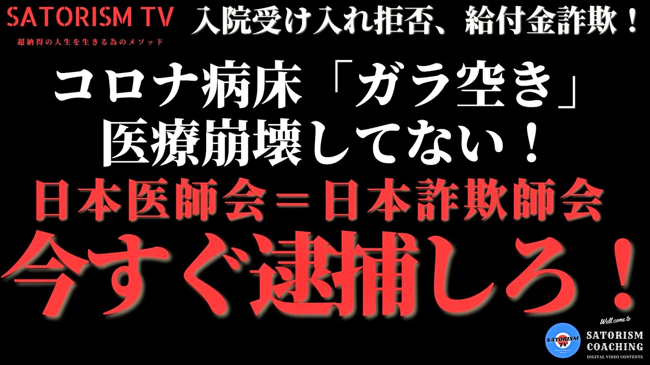 【動画解説】<br>コロナ補助金詐欺の最大の罪人は日本医師会だ。<br>これで病院や医者の信頼は地に墜ちたな。<br><br>◆Facebookページ「Club New Order」のフォローはコチラ!<br><a href="https://www.facebook.com/SATORISM" target="_blank" rel="noopener nofollow">https://www.facebook.com/SATORISM</a><br><br>◆浅村正樹の新刊本『バカのための思考法』のご予約はコチラ!<br> こんな時代にこそ是非読んでください!<br>※10冊以上ご購入の方には特典!浅村が直接会いに行ってサインします!<br><br><a href="https://www.amazon.co.jp/%E3%83%90%E3%82%AB%E3%81%AE%E3%81%9F%E3%82%81%E3%81%AE%E6%80%9D%E8%80%83%E6%B3%95-%E6%B5%85%E6%9D%91-%E6%AD%A3%E6%A8%B9/dp/4295406104/ref=sr_1_1?__mk_ja_JP=%E3%82%AB%E3%82%BF%E3%82%AB%E3%83%8A&dchild=1&keywords=%E3%83%90%E3%82%AB%E3%81%AE%E3%81%9F%E3%82%81%E3%81%AE%E6%80%9D%E8%80%83%E6%B3%95&qid=1631023304&s=books&sr=1-1" target="_blank" rel="noopener nofollow">https://www.amazon.co.jp/%E3%83%90%E3%82%AB%E3%81%AE%E3%81%9F%E3%82%81%E3%81%AE%E6%80%9D%E8%80%83%E6%B3%95-%E6%B5%85%E6%9D%91-%E6%AD%A3%E6%A8%B9/dp/4295406104/ref=sr_1_1?__mk_ja_JP=%E3%82%AB%E3%82%BF%E3%82%AB%E3%83%8A&dchild=1&keywords=%E3%83%90%E3%82%AB%E3%81%AE%E3%81%9F%E3%82%81%E3%81%AE%E6%80%9D%E8%80%83%E6%B3%95&qid=1631023304&s=books&sr=1-1</a><br />◆電子書籍「SATORISM」超納得の人生を生きる為のメソッド!<br>amazonにて好評発売中!<br><a href="https://www.amazon.co.jp/SATORISM-%E5%8F%A4%E4%BA%8B%E8%A8%98-%E9%87%88%E8%BF%A6%C3%97%E5%9F%BA%E7%9D%A3%C3%B7%E7%B4%A0%E7%B2%92%E5%AD%90-SEX%E2%80%90%E8%82%89%E4%BD%93-%EF%BC%9D%E7%A5%9E%E2%89%A6%E6%88%91-ebook/dp/B07CTDNJCR/ref=sr_1_1?__mk_ja_JP=%E3%82%AB%E3%82%BF%E3%82%AB%E3%83%8A&dchild=1&keywords=%E6%B5%85%E6%9D%91%E6%AD%A3%E6%A8%B9&qid=1606834294&sr=8-1" target="_blank" rel="noopener nofollow">https://www.amazon.co.jp/SATORISM-%E5%8F%A4%E4%BA%8B%E8%A8%98-%E9%87%88%E8%BF%A6%C3%97%E5%9F%BA%E7%9D%A3%C3%B7%E7%B4%A0%E7%B2%92%E5%AD%90-SEX%E2%80%90%E8%82%89%E4%BD%93-%EF%BC%9D%E7%A5%9E%E2%89%A6%E6%88%91-ebook/dp/B07CTDNJCR/ref=sr_1_1?__mk_ja_JP=%E3%82%AB%E3%82%BF%E3%82%AB%E3%83%8A&dchild=1&keywords=%E6%B5%85%E6%9D%91%E6%AD%A3%E6%A8%B9&qid=1606834294&sr=8-1</a>