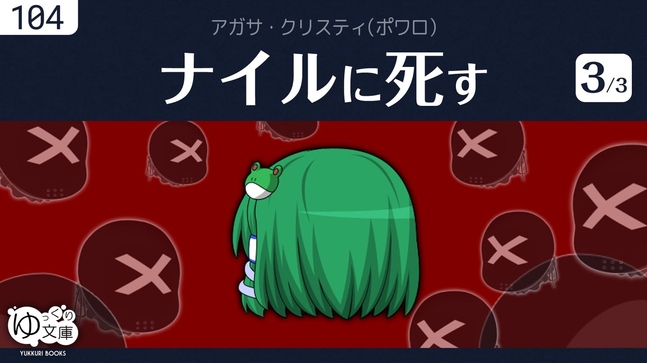 <span style="color: #ff0000;"><strong>104x3 終わりにしよう──</strong></span><br>事件の解決したが、永遠に解けないミステリーが残った。それはポワロを苛立たせ、かつ魅了する。向こう側を見ながら、ポワロはなにを思うのか。<br><span style="color: green;">Death on the Nile (1937) by Agatha Christie</span><br><br>(うp主より)<br>いかがでした? 見えているものが、見えてましたか?<br><br>●ゆっクリスティ <a href="https://www.nicovideo.jp/mylist/59497715" target="_blank" rel="noopener">mylist/59497715</a><br>◆ミス・マープル<br><a href="https://www.nicovideo.jp/watch/sm24238713" class="watch">sm24238713</a> 完璧なメイド<br><a href="https://www.nicovideo.jp/watch/sm25512772" class="watch">sm25512772</a> 動機と機会<br><a href="https://www.nicovideo.jp/watch/sm26942176" class="watch">sm26942176</a> 青いゼラニウム<br><a href="https://www.nicovideo.jp/watch/sm30507320" class="watch">sm30507320</a> ポケットにライ麦を #1<br><a href="https://www.nicovideo.jp/watch/sm30511824" class="watch">sm30511824</a> #2<br><a href="https://www.nicovideo.jp/watch/sm30512247" class="watch">sm30512247</a> #3<br><a href="https://www.nicovideo.jp/watch/sm32946182" class="watch">sm32946182</a> パディントン発4時50分 #1<br><a href="https://www.nicovideo.jp/watch/sm38609548" class="watch">sm38609548</a> # 原作に近い版<br><a href="https://www.nicovideo.jp/watch/sm33091342" class="watch">sm33091342</a> 鏡は横にひび割れて<br><a href="https://www.nicovideo.jp/watch/sm37048244" class="watch">sm37048244</a> 予告殺人 #1 殺人のお知らせ<br><a href="https://www.nicovideo.jp/watch/sm37064125" class="watch">sm37064125</a> #2 ゲドラーの遺産<br><a href="https://www.nicovideo.jp/watch/sm37075231" class="watch">sm37075231</a> #3 甘美なる死<br><a href="https://www.nicovideo.jp/watch/sm37088256" class="watch">sm37088256</a> #4 やさしい殺人者<br><a href="https://www.nicovideo.jp/watch/sm37202036" class="watch">sm37202036</a> #ドラ・バンナーは間違っていたか?<br><br>◆ポワロ<br><a href="https://www.nicovideo.jp/watch/sm25458371" class="watch">sm25458371</a> スズメバチの巣<br><a href="https://www.nicovideo.jp/watch/sm38918082" class="watch">sm38918082</a> オリエント急行の殺人:0 予告編<br><a href="https://www.nicovideo.jp/watch/sm38924413" class="watch">sm38924413</a> #1<br><a href="https://www.nicovideo.jp/watch/sm39365170" class="watch">sm39365170</a> ナイルに死す #1 愛がすべて<br><a href="https://www.nicovideo.jp/watch/sm39367017" class="watch">sm39367017</a> #2 まわりは敵ばかり<br><a href="https://www.nicovideo.jp/watch/sm39368986" class="watch">sm39368986</a> <span style="color: #ff00ff;"><strong>#3 終わりにしよう</strong></span><br><a href="https://www.nicovideo.jp/watch/sm40164143" class="watch">sm40164143</a> 消えた遺言書<br><br>◆ほか<br><a href="https://www.nicovideo.jp/watch/sm33975066" class="watch">sm33975066</a> そして誰もいなくなった #1<br><a href="https://www.nicovideo.jp/watch/sm33981315" class="watch">sm33981315</a> #2<br><a href="https://www.nicovideo.jp/watch/sm33986818" class="watch">sm33986818</a> #PV 松谷祐子「愛はブーメラン」<br><br>●ゆっくり文庫について<br>全部:<a href="https://www.nicovideo.jp/mylist/74874627" target="_blank" rel="noopener">mylist/74874627</a><br>近況:<a href="https://twitter.com/trynext" target="_blank" rel="noopener nofollow">https://twitter.com/trynext</a><br>---<br><br><br>
