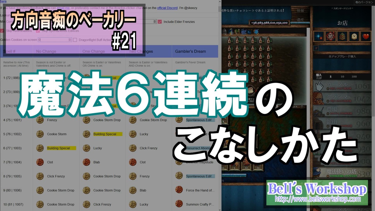 魔法6連続で使う方法、それとキャラメル砂糖を確実に得る方法です。<br><br>前:<a href="https://www.nicovideo.jp/watch/sm39299239" class="watch">sm39299239</a> 次:<a href="https://www.nicovideo.jp/watch/sm39462134" class="watch">sm39462134</a> マイリスト:<a href="https://www.nicovideo.jp/mylist/70729379" target="_blank" rel="noopener">mylist/70729379</a><br>※Part21裏話:<a href="http://bellsworkshop.com/cookie-part21/" target="_blank" rel="noopener nofollow">http://bellsworkshop.com/cookie-part21/</a><br><br>ブログ<br><a href="http://www.bellsworkshop.com/" target="_blank" rel="noopener nofollow">http://www.bellsworkshop.com/</a><br><br>Youtubeチャンネル<br><a href="http://www.youtube.com/user/bellsworkshop2" target="_blank" rel="noopener nofollow">http://www.youtube.com/user/bellsworkshop2</a><br><br>Music:purple planet royalty free music <a href="http://www.purple-planet.com/" target="_blank" rel="noopener nofollow">http://www.purple-planet.com/</a><br>Sound:On-Jin ~音人~ <a href="http://on-jin.com/" target="_blank" rel="noopener nofollow">http://on-jin.com/</a><br>