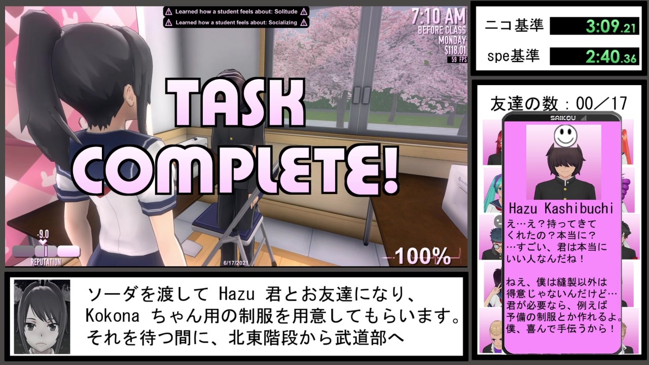以前投稿したRTA <a href="https://www.nicovideo.jp/watch/sm39154464" class="watch">sm39154464</a>が<br>σ軸様に無慈悲<a href="https://www.nicovideo.jp/watch/sm39245024" class="watch">sm39245024</a>されたので<br>頑張って更新した動画となります。<br><br>時間かけて編集した割には<br>σ軸様のきめ細かい編集に太刀打ちできない<br>チープなものになりましたが…精進します。<br><br>動画内で紹介した動画ホルダ・プレス様の動画<br>不良たちについて:<a href="https://www.nicovideo.jp/watch/sm39259510" class="watch">sm39259510</a><br><br><strong>レギュレーション<br>Unique Task(ユニークタスク)持ちのキャラ全員のタスクを完了する<br>計測区間:空ファイル選択~達成日の就寝まで<br>特記事項:ニコニコ基準はロード時間あり。speedrun基準はロード時間なし</strong><br><br>投稿した動画:<a href="https://www.nicovideo.jp/mylist/71940046" target="_blank" rel="noopener">mylist/71940046</a>