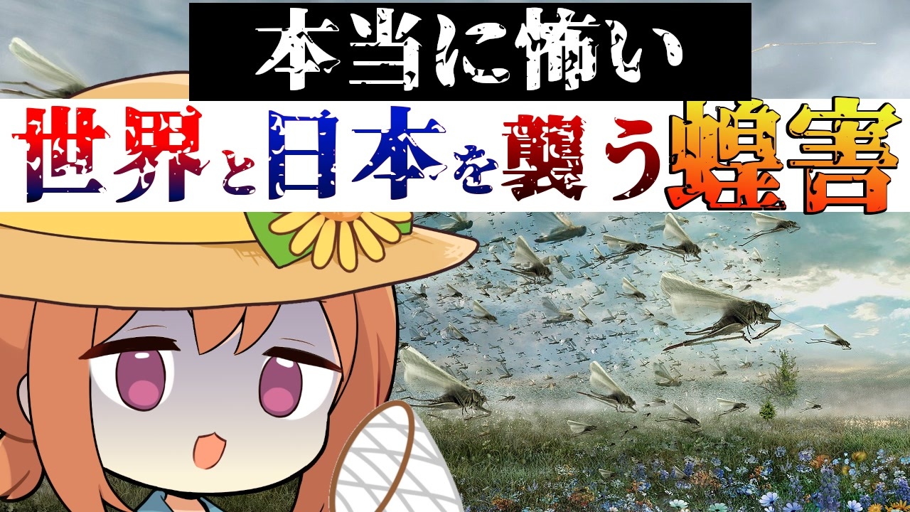 世界には人間や人間の生活に害をもたらす昆虫がたくさんおりますが、その害虫の中でも蝗害、主にサバクトビバッタなどの害虫がいます<br><br>↓↓↓最新動画↓↓↓<br>【最新動画!奇妙なキノコ:<a href="https://www.nicovideo.jp/watch/sm39475762" class="watch">sm39475762</a>】<br><br>【もしよろしかったら、いいねフォローお願いします <strong>いいねに蝗害 小ネタ</strong>】<br><br>【ニコニコ一般の方は過去動画見るだけなら画質綺麗なのでyoutubeおすすめです】<br>おねカナ不思議旅【ゆっくり解説】 - YouTube<br><br><br><br><br>【コメントのお返し】<br>相対的貧困層って食事に困るのだっけ?<br>⇨生活が苦しくて食費を削る方も多いらしいですね<br><br>カナちゃん救いたい<br>⇨ありがとう(*^▽^*)<br><br>初見足ないけど幽霊なんか?<br>⇨そうです(o^^o) <br> 幽霊のお姉さんとカナちゃんです<br><br>独特で面白い<br>⇨ありがとうございます。嬉しいです。(^-^)<br>実は、初投稿前まで、全くニコニコ見たことなく、レイマリも殆ど見たことがないので、多分見てない分、どことも似てないと思います。(^-^)<br><br>おねカナどっちも好こ<br>⇨ありがとうございます。<br>楽しんでいただけたらありがたいです。<br><br>【広告くださった皆様へ】<br>ありがとうございます。最近投稿が少し減り申し訳ないです。週に一度は投稿します。<br><br>【使用素材】<br>空想曲線 <a href="https://kopacurve.blog.fc2.com/" target="_blank" rel="noopener nofollow">https://kopacurve.blog.fc2.com/</a><br><br>【使用BGM・効果音】<br>◆DOVA-SYNDROME<br><a href="http://dova-s.jp/" target="_blank" rel="noopener nofollow">http://dova-s.jp/</a><br>◆MusMus<br><a href="https://musmus.main.jp/info.html" target="_blank" rel="noopener nofollow">https://musmus.main.jp/info.html</a><br>◆効果音ラボ<br><a href="https://soundeffect-lab.info/" target="_blank" rel="noopener nofollow">https://soundeffect-lab.info/</a><br>◆効果音:ポケットサウンド –<br>ボ色Ckcmg8yBpJk5I1fwu0sabJg<br>◆創作堂さくら紅葉<br><a href="https://yukizakura.net" target="_blank" rel="noopener nofollow">https://yukizakura.net</a><br><br>※この動画は実在する人物や名称に一切関係なくフィクションです。<br>※著作権や肖像権を侵害する目的は一切ございません。