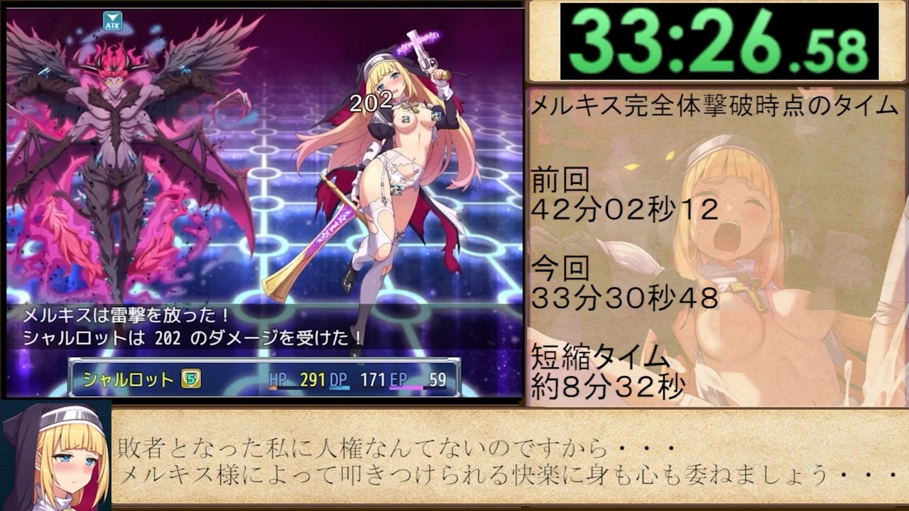 アンチョビの誕生日当日滑り込み投稿なので初投稿です!!!<br><br>ノクターン式はやってて楽しいけど、右枠のネタを入れにくいのが若干の難点<br><br>いいね!を押すと次に走る予定(変更有)のゲームが分かります。<br><br>【No Future】様制作<br>「祓魔少女シャルロット」ラスボス撃破までのRTAの再走をさせて頂きました。<br><br>○~あらすじ~○<br><br>クラスメイトを救うために立ち上がった歴戦のエクソシスト シャルロット、<br>しかし一瞬の隙を突かれて弱体化の呪いを掛けられてしまった!<br>敵拠点の中心で敵の猛攻に耐え、悪魔を祓え!<br>果たしてシャルロットは純潔を守ったままクラスメイトを救い、<br>上級悪魔「メルキス」を倒すことができるのか!?<br><br><br><br>作品リンクはこちら!買うなら今!!<br><br><span style="color: #ff0000; font-size: 18px;"><strong><i>祝!!「祓魔少女シャルロット」販売数26,376突破!!</i></strong></span><span style="color: #ff0000; font-size: 18px;"><strong>!</strong></span><br><br><br><br>美少女シスター陵辱RTAマイリスト→<a href="https://www.nicovideo.jp/mylist/71433234" target="_blank" rel="noopener">mylist/71433234</a><br>ドスケベくノ一陵辱RTAマイリスト→<a href="https://www.nicovideo.jp/mylist/71433237" target="_blank" rel="noopener">mylist/71433237</a><br>美少女エスパー陵辱RTAマイリスト→<a href="https://www.nicovideo.jp/mylist/71453605" target="_blank" rel="noopener">mylist/71453605</a><br>正義の魔法少女陵辱RTAマイリスト→<a href="https://www.nicovideo.jp/mylist/72027465" target="_blank" rel="noopener">mylist/72027465</a><br>ムチムチな天使陵辱RTAマイリスト→<a href="https://www.nicovideo.jp/mylist/72196860" target="_blank" rel="noopener">mylist/72196860</a><br>正義のヒロイン陵辱RTAマイリスト→<a href="https://www.nicovideo.jp/mylist/72424512" target="_blank" rel="noopener">mylist/72424512</a><br><br>Twitter ID→@Duce_Ishizawa