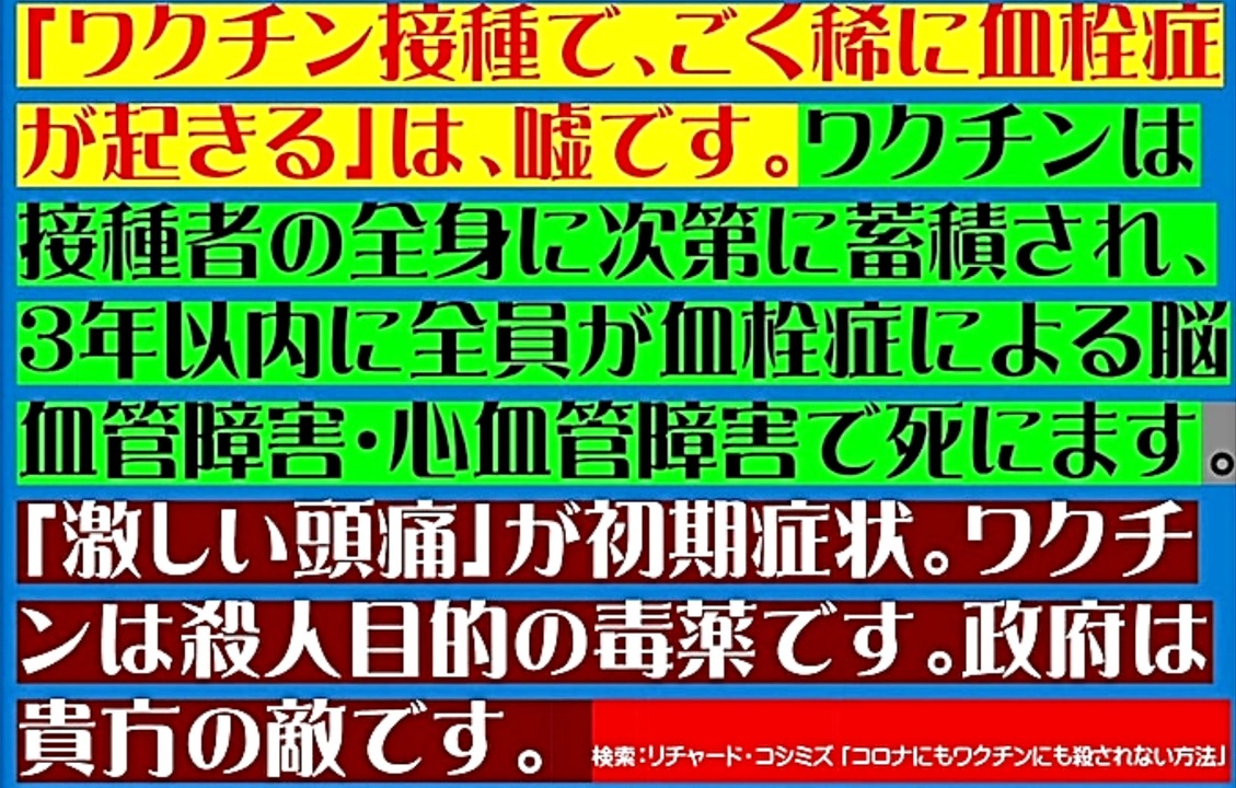 <span style="color: #cc4125;"><strong>「 テーマ: 新型コロナウイルス戦争 337 」</strong></span><br><br><span style="color: #ff0000;"><strong>「『新型コロナワクチン死』ラッシュが始まっている。気温の低下により、血栓症が頻発している」</strong></span><br><br> <span style="color: #38761d;">◆</span><span style="color: #38761d;"><strong>リチャード・コシミズ 公式 ブログ</strong></span><br> <a href="https://ameblo.jp/richardneversurrender/" target="_blank" rel="noopener nofollow">https://ameblo.jp/richardneversurrender/</a><br><br> <span style="color: #38761d;">◆</span><span style="color: #38761d;"><strong>リチャード・コシミズ 公式 ホームページ</strong></span><br> <a href="http://richardkoshimizu.boo.jp/" target="_blank" rel="noopener nofollow">http://richardkoshimizu.boo.jp/</a><br><br> <span style="color: #38761d;">◆</span><span style="color: #38761d;"><strong>リチャード・コシミズ 講演会 公式 動画ギャラリー</strong></span><br> <a href="http://www.t-sskk.com/richardkoshimizu/video-gallery/index.html" target="_blank" rel="noopener nofollow">http://www.t-sskk.com/richardkoshimizu/video-gallery/index.html</a><br>
