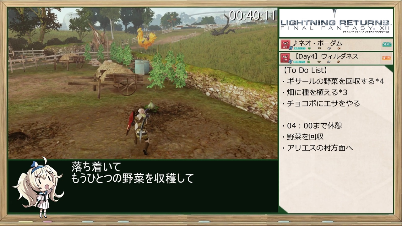学会提出論文<br>「60FPS環境下における野菜消失バグの回避モーションについて」<br><br>【GAME】 <br>LIGHTNING RETURNS FINAL FANTASYⅩⅢ<br>(ライトニングリターンズファイナルファンタジー13)<br>Steam(PC版)<br><br>【レギュレーション】<br>・計測区間:ゲームスタート選択~ラスボス撃破後リザルト表示<br>・難易度:ノーマル<br>・DLC使用不可<br>・オンライン要素使用不可<br><br>【<a href="https://www.nicovideo.jp/mylist/71610934" target="_blank" rel="noopener">mylist/71610934</a>】 <br>PREV≫<a href="https://www.nicovideo.jp/watch/sm39361434" class="watch">sm39361434</a><br>NEXT≫<a href="https://www.nicovideo.jp/watch/sm39425693" class="watch">sm39425693</a><br><br>Part.1≫<a href="https://www.nicovideo.jp/watch/sm39215131" class="watch">sm39215131</a><br><br>ファブラノヴァ神話&これまでのあらすじ≫<a href="https://www.nicovideo.jp/watch/sm39205369" class="watch">sm39205369</a><br><br>≪前作RTA≫Bullet Girls Phantasia RTA_3:16:45_Part.1<br>≫<a href="https://www.nicovideo.jp/watch/sm38304057" class="watch">sm38304057</a><br><br>≪ウマ娘RTAもやってます≫トレーナーID:530 912 477<br>≫<a href="https://www.nicovideo.jp/watch/sm38417256" class="watch">sm38417256</a><br><br>Other Cielo’s Title <br>【<a href="https://www.nicovideo.jp/mylist/50418741" target="_blank" rel="noopener">mylist/50418741</a> 】<br><br>twitter <a href="https://twitter.com/Cielo_Polo" target="_blank" rel="noopener nofollow">https://twitter.com/Cielo_Polo</a><br>