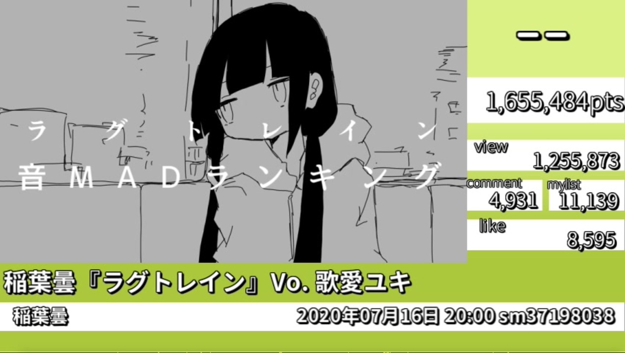(音MADのランキング動画は)初投稿です。<br>元凶の動画から2ヶ月半、関連動画の投稿も一段落してきたので作りました。TOP50です。<br><br>集計式:再生数+コメント数+マイリスト数×20+いいね!数×20<br>集計対象:「ラグトレイン」「音MAD」の両方、または「ラグトレイン音MADリンク」のタグを含む動画<br>除外対象:音MADではないもの(映像MAD、メイキングなど)<br> その他は除外しないためR-18・例のアレコンテンツ等が苦手な方はご注意ください。<br><br>すべての本家様:<a href="https://www.nicovideo.jp/watch/sm37198038" class="watch">sm37198038</a><br>使用させていただいた動画(ランキング結果):マイリストの公開は終了しました<br><br>【追記】週刊ニコニコランキング #751で紹介していただきました。 <span style="color: #4a86e8;"><u><a href="https://www.nicovideo.jp/watch/sm39400669" class="watch">sm39400669</a></u></span><br><span style="font-size: 16px;"><strong>【4/14追記】最新版(別投稿者) </strong></span><span style="color: #4a86e8; font-size: 16px;"><strong><u><a href="https://www.nicovideo.jp/watch/sm40314283" class="watch">sm40314283</a></u></strong></span><strong> </strong>が投稿されました。<br>【5/18追記】映像MADの一部に使用していただきました。<span style="color: #4a86e8;"><u><a href="https://www.nicovideo.jp/watch/sm40481580" class="watch">sm40481580</a></u></span>