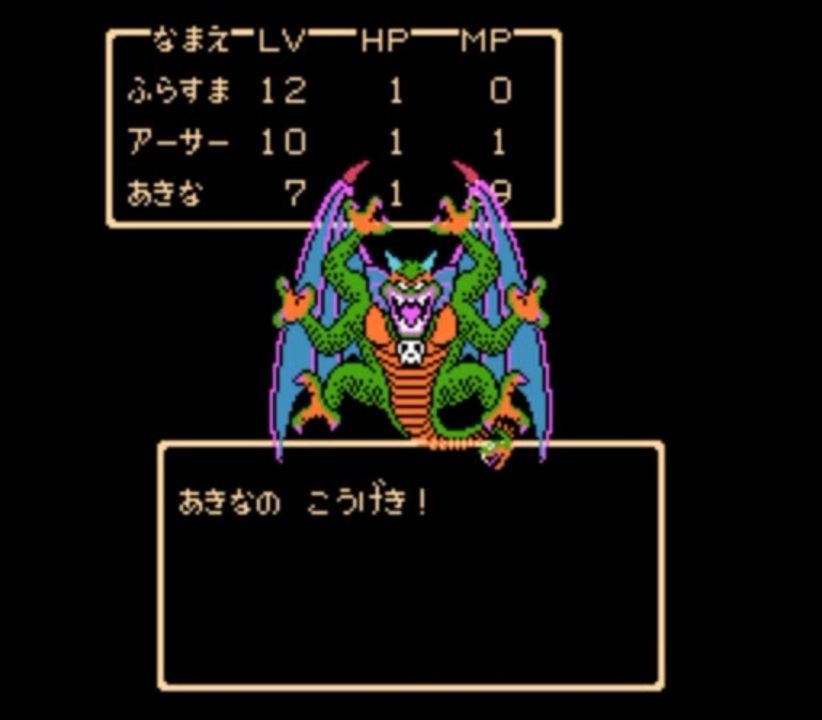 【TAS】FC版ドラクエ2_最少戦闘勝利数クリア_1時間5分54秒<br><br>時間:1時間5分54秒<br>追記回数:9796回<br>ソフト:ファミコン版ドラゴンクエストⅡ 悪霊の神々<br><br>最少戦闘勝利数クリアのTASを作成してみました。<br>理論上だと、9回の勝利戦闘にてクリア可能ですが、<br>ハーゴン城での数々の戦いは、実機では厳しすぎると思います。<br>私が確認した限りでは、最少勝利回数クリアをする動画は未確認でしたので、<br>早速ですが作成してみました。<br>是非、最後までお楽しみ頂ければと思います。<br><br>■以下の縛りで、プレイしました。<br>・道中の敵は一切倒さない。固定敵も最低限の数だけ倒して勝利する。<br>・裏技未使用、リセットなし。<br>・メッセージスピードは「SLOW」にする(SLOWだと1撃ずつ調整出来るが、FASTだと1ターンずつの調整になってしまう為)。<br><br>■タイムラップ<br>王様からの差し入れを置き忘れて(?)冒険開始 0:45<br>1回目の勝利戦闘(@ルプガナ_グレムリン×2) 17:55<br>2回目の勝利戦闘(@デルコンダル_キラータイガー) 24:15<br>実は負けても大丈夫な戦闘(@ムーンペタ_ベビル×2) 25:45<br>3回目の勝利戦闘(@大灯台_グレムリン×4) 30:40<br>4回目の勝利戦闘(@海底の洞窟_じごくのつかい×2) 40:40<br>ハーゴン城突入直前にパスワード取得 49:00<br>5回目の勝利戦闘(@ハーゴン城_アトラス) 53:20<br>6回目の勝利戦闘(@ハーゴン城_バズズ) 55:55<br>7回目の勝利戦闘(@ハーゴン城_ベリアル) 57:00<br>8回目の勝利戦闘(@ハーゴン城_ハーゴン) 58:55<br>9回目の勝利戦闘(@ハーゴン城_シドー) 59:40<br><br>この動画で利用している株式会社スクウェア・エニックスを代表とする共同著作者が権利を所有する著作物及びスギヤマ工房有限会社が権利を所有する楽曲の転載・配布は禁止いたします。<br>© 1987 ARMOR PROJECT/BIRD STUDIO/SPIKE CHUNSOFT/SQUARE ENIX All Rights Reserved.<br>© SUGIYAMA KOBO<br><br>当動画はユーチューブでも上げています<br><a href="https://youtu.be/iZCcD6I187s" target="_blank" rel="noopener nofollow">https://youtu.be/iZCcD6I187s</a><br><br>【TAS】FC版ドラクエ3_最少戦闘勝利数クリア<br><a href="https://www.nicovideo.jp/watch/sm39525985" class="watch">sm39525985</a>