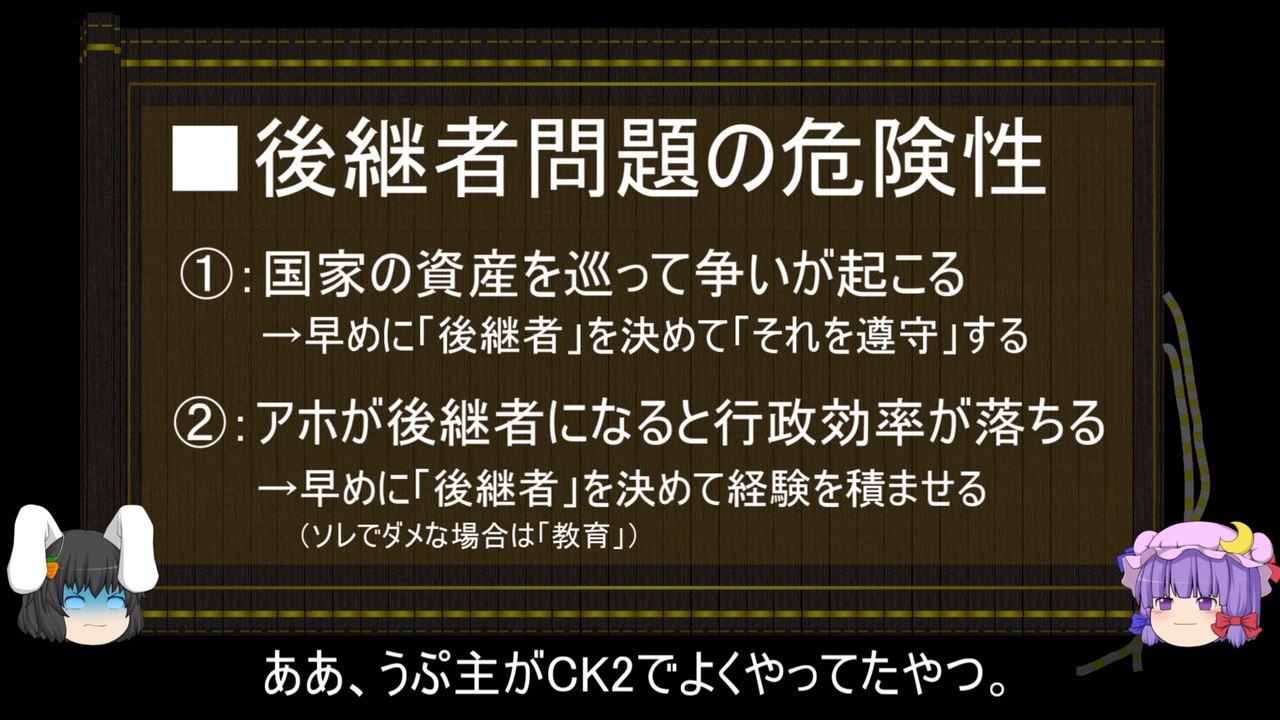 今までの北伐動画で「後継者」に関するコメントが結構あったので今回はそれについて考察してみました。<br>一回で済ませるつもりでしたが結構長くなったので後編に続きます。<br><br>BGM:伝承の丘 - 秋山裕和<br><a href="https://www.youtube.com/watch?v=h3BifNk9lnU" target="_blank" rel="noopener nofollow">https://www.youtube.com/watch?v=h3BifNk9lnU</a><br><br>動画作成ツール:ゆっくりムービーメーカー3<br><a href="https://manjubox.net/ymm3/" target="_blank" rel="noopener nofollow">https://manjubox.net/ymm3/</a><br><br>立ち絵:キャラ素材(きつねゆっくり) - Nicotalk &キャラ素材配布所<br><a href="http://www.nicotalk.com/charasozai_kt.html" target="_blank" rel="noopener nofollow">http://www.nicotalk.com/charasozai_kt.html</a><br><br>AquesTalkライセンス購入済み